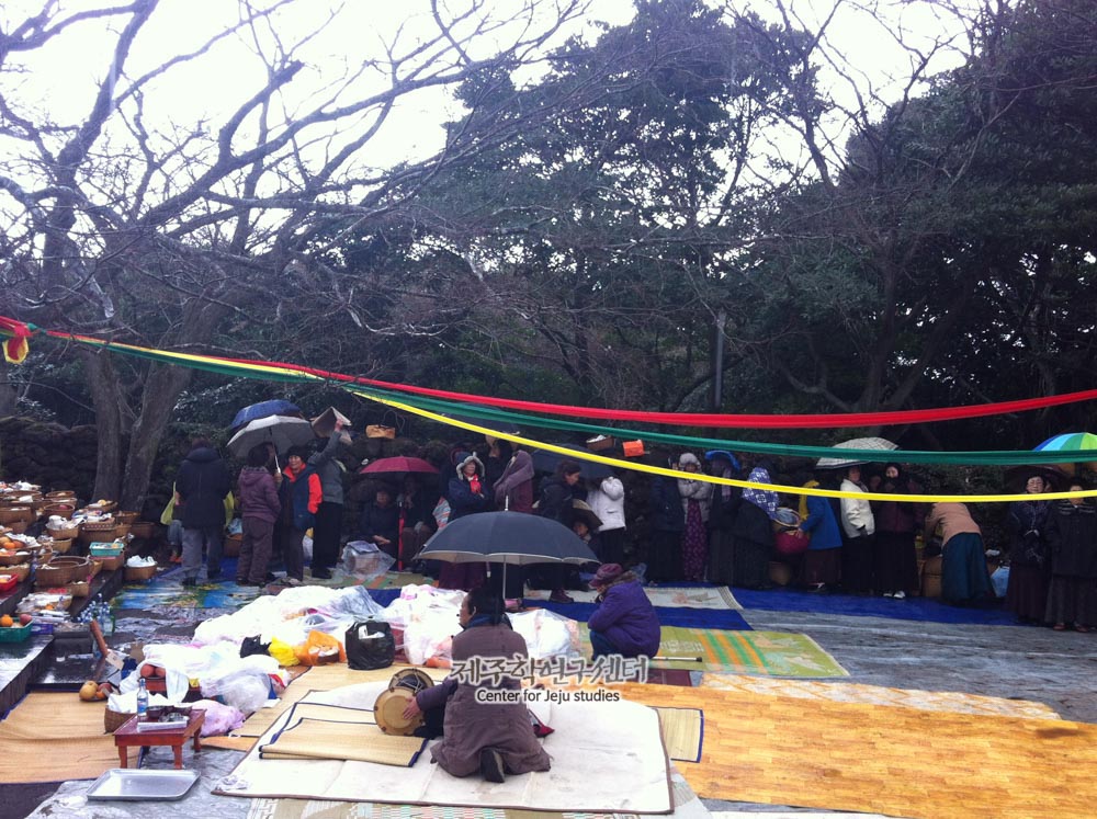 [장면설명] 심방이 앚인제로 굿을 하고 있는 모습이다. [공통설명] 신과세제는 마을의 본향당에서 매년 정월에 신에게 새해를 맞이하여 과세(過歲)를 드리는 의미로 벌이는 굿이다. 그 어원은 ‘신-’은 일반어휘와 구별하기 위하여 무속에서 흔히 덧붙이는 접두사이며 과세는 한자어 ‘過歲’로 과세문안(過歲問安)의 뜻이다. 송당리 본향 웃손당 당오름 백주할망당의 당신명은 웃손당 금백주 할당이다. 송당계 모신(母神)으로 좌정형태는 독좌형으로 여신 혼자 좌정한 형태이다. 직능은 생산(生産), 물고(物故), 호적(戶籍), 장적(帳籍)이다. 제일은 신과세제 음력 1월13일, 영등손맞이 음력 2월13일, 마불림제 음력 7월13일, 시만곡대제 음력 10월13일이다. 제물로는 육류를 쓰지 않는다. 당신화는 육지에서 들어온 백주또와 제주태생 소로소천국이 부부가 되어사는데 백주또의 권유로 농사를 짓게 된다. 어느날 소로소천국은 배가 고파 농사 짓던 소를 모두 잡아먹어버린다. 이 사실을 안 백주또가 화가 나서 별거를 하게 된다. 백주또와 소로소천국 사이의 자식들이 제주도 곳곳에 당신으로 좌정하게 된다.