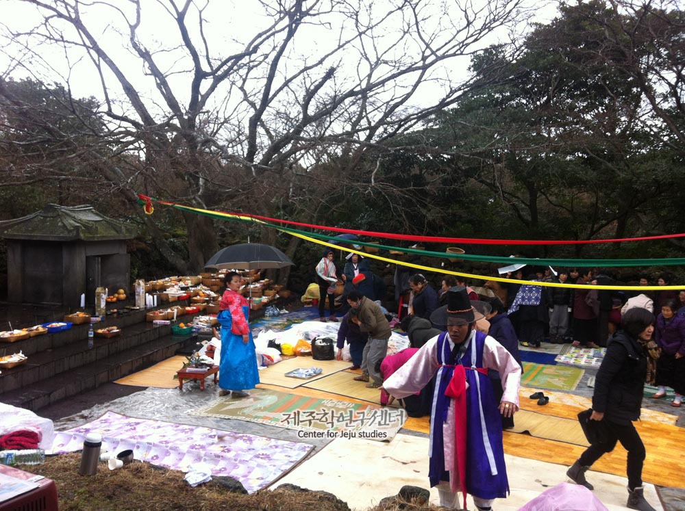 송당리 신과세제(2014년) 마을주민들이 제단을 향해 절을 하고 있는 모습