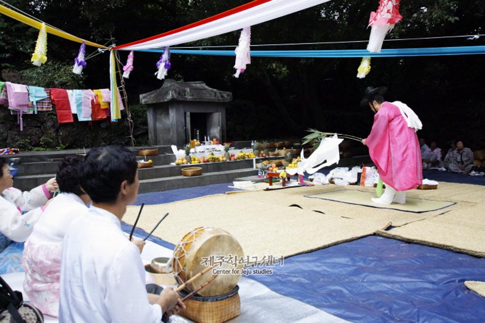 [장면설명] 김윤수 심방이 초감제 제차를 하는 모습이다. [공통설명] 마불림제는 마을의 본향당에서 매년 음력 7월에 행해지는 의례로 달리 ‘백중제’라고도 한다. 마불림제는 ‘마’를 일종의 곰팡이로 인식하여 장마철에 습기로 인하여 본향당에 모셔진 신옷이나 여러 가지 물품 등에 곰팡이가 슬기 때문에 이를 청소하는 의미로 해석하여 신옷을 햇빛에 말리는 청소에 의한 신의쇄폭제(神衣灑曝祭) 의미가 있고 농사와 축산의 풍요와 번성을 기원하는, 특히 우마(牛馬)의 번성(繁盛)을 위해 축산신(畜産神)인 ‘정수남’에게 올리는 제의라는 의미도 있다. 송당리 본향 웃손당 당오름 백주할망당의 당신명은 ‘웃손당 금백주 할망’이다. 송당계 모신(母神)으로 좌정형태는 독좌형이고 여신 혼자 좌정한 형태이다. 직능은 생산(生産), 물고(物故), 호적(戶籍), 장적(帳籍)이다. 제일은 신과세제 음력 1월 13일, 영등손맞이 음력 2월 13일, 마불림제 음력 7월 13일, 시만곡대제 음력 10월 13일이다. 제물로는 육류를 쓰지 않는 것이 특징이다. 당신화의 내용은 “육지에서 들어온 백주또와 제주 태생 소로소천국이 부부가 되어 사는데 백주또의 권유로 농사를 짓게 된다. 어느날 소로소천국은 배가 고파 농사 짓던 소를 모두 잡아먹어버린다. 이 사실을 안 백주또가 화가 나서 별거를 하게 된다. 백주또와 소로소천국 사이의 자식들이 제주도 곳곳에 당신으로 좌정하게 된다.”는 이야기이다.