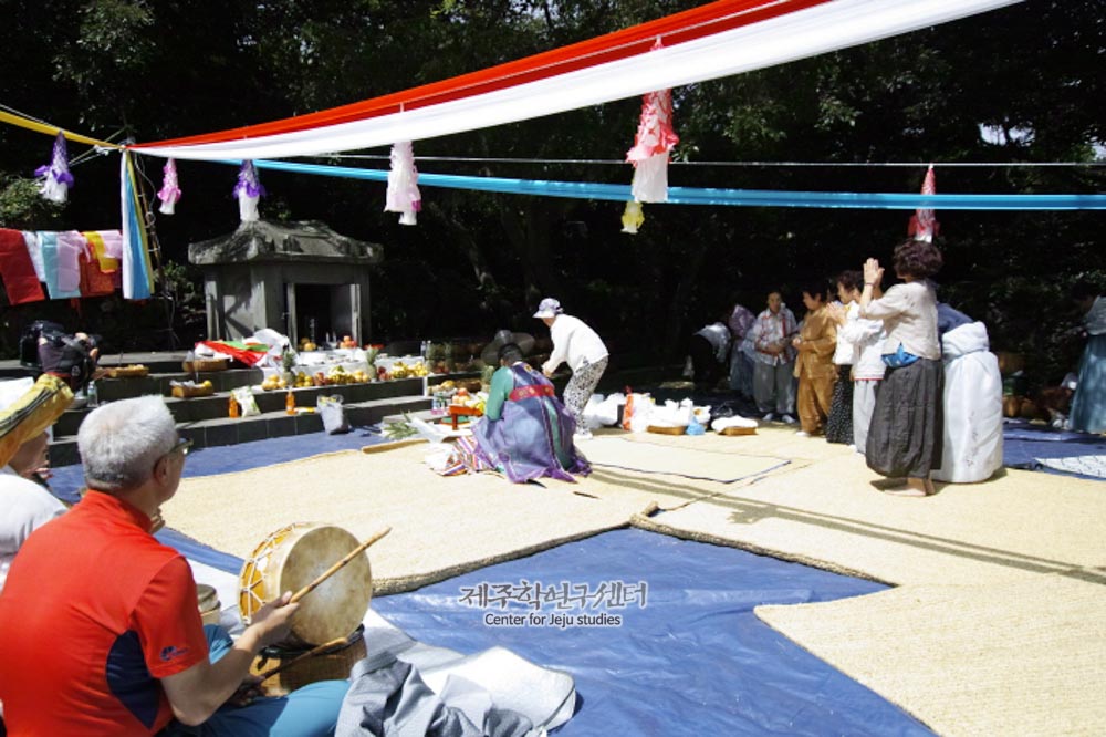 [장면설명] 김윤수 심방이 초감제 중 군문열림 제차를 하는 모습이다. [공통설명] 마불림제는 마을의 본향당에서 매년 음력 7월에 행해지는 의례로 달리 ‘백중제’라고도 한다. 마불림제는 ‘마’를 일종의 곰팡이로 인식하여 장마철에 습기로 인하여 본향당에 모셔진 신옷이나 여러 가지 물품 등에 곰팡이가 슬기 때문에 이를 청소하는 의미로 해석하여 신옷을 햇빛에 말리는 청소에 의한 신의쇄폭제(神衣灑曝祭) 의미가 있고 농사와 축산의 풍요와 번성을 기원하는, 특히 우마(牛馬)의 번성(繁盛)을 위해 축산신(畜産神)인 ‘정수남’에게 올리는 제의라는 의미도 있다. 송당리 본향 웃손당 당오름 백주할망당의 당신명은 ‘웃손당 금백주 할망’이다. 송당계 모신(母神)으로 좌정형태는 독좌형이고 여신 혼자 좌정한 형태이다. 직능은 생산(生産), 물고(物故), 호적(戶籍), 장적(帳籍)이다. 제일은 신과세제 음력 1월 13일, 영등손맞이 음력 2월 13일, 마불림제 음력 7월 13일, 시만곡대제 음력 10월 13일이다. 제물로는 육류를 쓰지 않는 것이 특징이다. 당신화의 내용은 “육지에서 들어온 백주또와 제주 태생 소로소천국이 부부가 되어 사는데 백주또의 권유로 농사를 짓게 된다. 어느날 소로소천국은 배가 고파 농사 짓던 소를 모두 잡아먹어버린다. 이 사실을 안 백주또가 화가 나서 별거를 하게 된다. 백주또와 소로소천국 사이의 자식들이 제주도 곳곳에 당신으로 좌정하게 된다.”는 이야기이다.