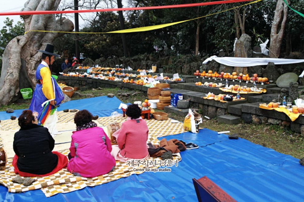 [장면설명] 김영철 심방이 초감제 중 신청궤 제차를 하는 모습이다. [공통설명] 신과세제는 마을의 본향당에서 매년 정월에 신에게 새해를 맞이하여 과세(過歲)를 드리는 의미로 벌이는 굿이다. 그 어원은 ‘신-’은 일반어휘와 구별하기 위하여 무속에서 흔히 덧붙이는 접두사이며 과세는 한자어 ‘過歲’로 과세문안(過歲問安)의 뜻이다. 와흘리 본향 한거리 하로산당의 당신명은 소로소천국 열쳇 아들 산신또, 서울 서정승 ᄄᆞ님애기이다. 송당계 산신과 외래계 산육신 계보로 좌정형태는 부부이좌형으로 남신, 여신 각각 하나씩 좌정해 있다. 직능은 생산(生産), 물고(物故), 호적(戶籍), 장적(帳籍)이다. 특별히 피부병과 육아에 대한 직능도 같이 가지고 있다. 제일은 신과세제 음력 1월 13일, 마불림제 음력 7월 13일이다. 당신화의 내용은 “송당리 백주또와 소로소천국 사이에 태어난 열 번째 아들로 옥황에 올라가 공부를 하고 내려와 좌정할 자리를 보다가 외대바지 선씨 하르방에게 와흘리 한거리 만년폭낭에 좌정한 신이 누구인지 묻고 서울 서정싱 ᄄᆞ님아기라는 말에 그곳에 찾아가 부부의 연을 맺고 좌정하게 되었다.”는 이야기이다.