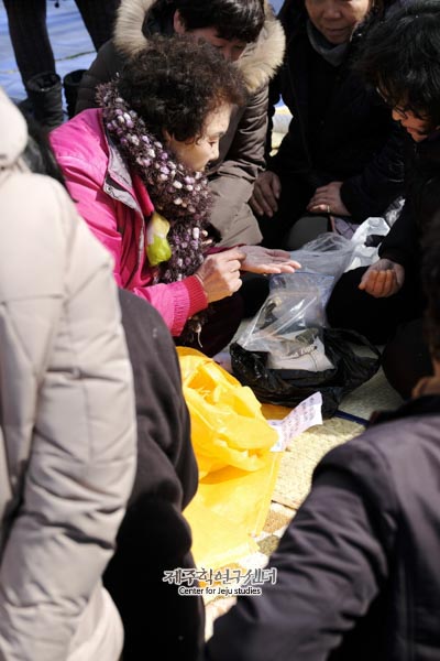 [장면설명] 심방이 도액막음 중 산받음 제차를 하는 모습이다. [공통설명] 신과세제는 마을의 본향당에서 매년 정월에 신에게 새해를 맞이하여 과세(過歲)를 드리는 의미로 벌이는 굿이다. 그 어원은 ‘신-’은 일반어휘와 구별하기 위하여 무속에서 흔히 덧붙이는 접두사이며 과세는 한자어 ‘過歲’로 과세문안(過歲問安)의 뜻이다. 와흘리 본향 한거리 하로산당의 당신명은 소로소천국 열쳇 아들 산신또, 서울 서정승 ᄄᆞ님애기이다. 송당계 산신과 외래계 산육신 계보로 좌정형태는 부부이좌형으로 남신, 여신 각각 하나씩 좌정해 있다. 직능은 생산(生産), 물고(物故), 호적(戶籍), 장적(帳籍)이다. 특별히 피부병과 육아에 대한 직능도 같이 가지고 있다. 제일은 신과세제 음력 1월 13일, 마불림제 음력 7월 13일이다. 당신화의 내용은 “송당리 백주또와 소로소천국 사이에 태어난 열 번째 아들로 옥황에 올라가 공부를 하고 내려와 좌정할 자리를 보다가 외대바지 선씨 하르방에게 와흘리 한거리 만년폭낭에 좌정한 신이 누구인지 묻고 서울 서정싱 ᄄᆞ님아기라는 말에 그곳에 찾아가 부부의 연을 맺고 좌정하게 되었다.”는 이야기이다.