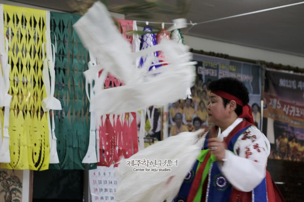 [장면설명] 신복만 심방이 요왕맞이 제차를 하는 모습이다. [공통설명] 영등굿은 해마다 음력 2월 초하루와 열나흘 사이에 제주도 해안가 마을의 당에서 영등신을 맞이하여 풍어 및 해상안전과 해녀들의 채취물인 소라‧전복‧미역 등의 풍성을 기원하는 굿이다. 주로 해녀 및 어업, 선박업자의 부녀자들을 중심으로 연행되는 영등굿은 봄을 맞는 문턱에서 행해지는 계절제로서의 의미가 있다. 영등굿은 내방신으로서 풍우신, 어업신, 해신, 해산물증식신 등으로 관념된다. 신명은 ‘영등’ 또는 ‘영등할망’이라 하고, 제명은 영등굿이라 한다. 굿에서는 ‘영등하르바님, 영등할마님, 영등 좌수(座首), 영등 벨감(別監), 영등 호장(戶長)’ 등 여러 관직명이 붙어 나와 영등신이 관속을 거느리고 오는 것으로 되어 있고, 제명도 마을에 따라 ‘영등맞이’, ‘영등손맞이’, ‘영등제’ 등으로 불려진다. 영등굿 신화로는 외눈박이나라설과 강남천자국설 두 가지가 전해지고 있다. “영등할망은 2월 초하루에 강남천자국 또는 외눈배기섬에서 구좌읍 우도로 제주도에 들어와서 바닷가를 돌면서 미역씨, 전복씨, 소라씨, 천초씨 등을 뿌려주어 해녀채취물을 풍성하게 해주고 14일에 다시 우도를 거쳐 본국으로 돌아간다.”는 이야기이다. 이 신앙은 제주도 뿐 아니라 한반도 일대에 분포하며, 그 신명은 ‘영등할만네·영등할맘·영등할마니·영등할마시·영등바람·풍신할만네·영등마고할마니’ 등으로 불리고 있으며 주로 풍신(風神)으로 신앙한다고 전해진다.