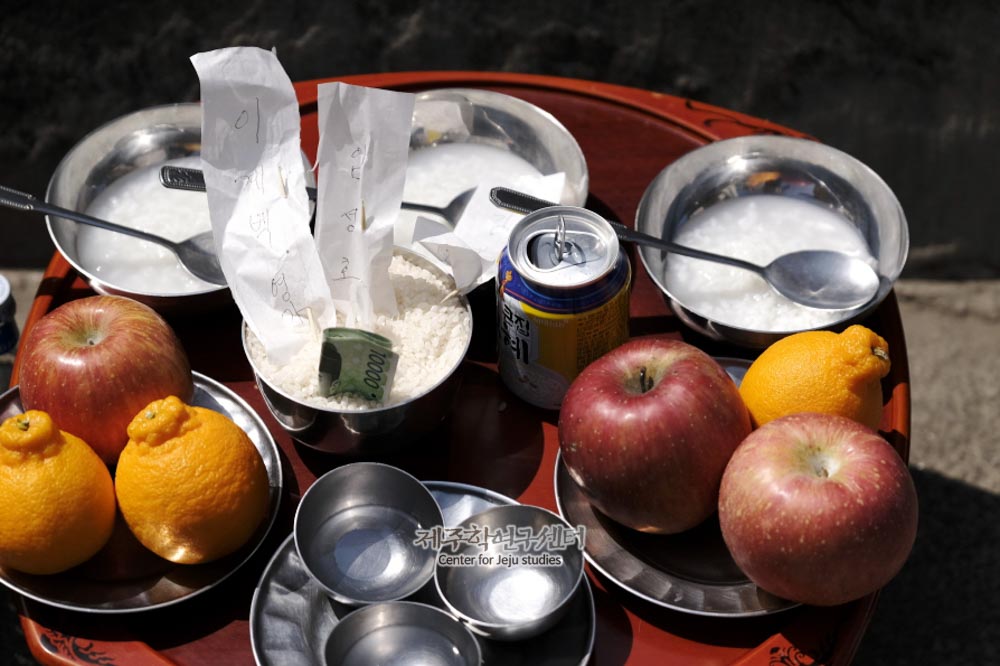 [장면설명] 사례리 풍어제(영등제)에 마을 사람들이 개별적으로 제물을 진설한 모습이다. [공통설명] 영등굿은 해마다 음력 2월 초하루와 열나흘 사이에 제주도 해안가 마을의 당에서 영등신을 맞이하여 풍어 및 해상안전과 해녀들의 채취물인 소라‧전복‧미역 등의 풍성을 기원하는 굿이다. 주로 해녀 및 어업, 선박업자의 부녀자들을 중심으로 연행되는 영등굿은 봄을 맞는 문턱에서 행해지는 계절제로서의 의미가 있다. 영등굿은 내방신으로서 풍우신, 어업신, 해신, 해산물증식신 등으로 관념된다. 신명은 ‘영등’ 또는 ‘영등할망’이라 하고, 제명은 영등굿이라 한다. 굿에서는 ‘영등하르바님, 영등할마님, 영등 좌수(座首), 영등 벨감(別監), 영등 호장(戶長)’ 등 여러 관직명이 붙어 나와 영등신이 관속을 거느리고 오는 것으로 되어 있고, 제명도 마을에 따라 ‘영등맞이’, ‘영등손맞이’, ‘영등제’ 등으로 불려진다. 영등굿 신화로는 외눈박이나라설과 강남천자국설 두 가지가 전해지고 있다. “영등할망은 2월 초하루에 강남천자국 또는 외눈배기섬에서 구좌읍 우도로 제주도에 들어와서 바닷가를 돌면서 미역씨, 전복씨, 소라씨, 천초씨 등을 뿌려주어 해녀채취물을 풍성하게 해주고 14일에 다시 우도를 거쳐 본국으로 돌아간다.”는 이야기이다. 이 신앙은 제주도 뿐 아니라 한반도 일대에 분포하며, 그 신명은 ‘영등할만네·영등할맘·영등할마니·영등할마시·영등바람·풍신할만네·영등마고할마니’ 등으로 불리고 있으며 주로 풍신(風神)으로 신앙한다고 전해진다.