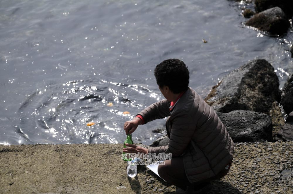 [장면설명] 마을 사람이 개별의례를 마치고 제반걷음을 하여 바다에 던지고 있는 모습이다. [공통설명] 영등굿은 해마다 음력 2월 초하루와 열나흘 사이에 제주도 해안가 마을의 당에서 영등신을 맞이하여 풍어 및 해상안전과 해녀들의 채취물인 소라‧전복‧미역 등의 풍성을 기원하는 굿이다. 주로 해녀 및 어업, 선박업자의 부녀자들을 중심으로 연행되는 영등굿은 봄을 맞는 문턱에서 행해지는 계절제로서의 의미가 있다. 영등굿은 내방신으로서 풍우신, 어업신, 해신, 해산물증식신 등으로 관념된다. 신명은 ‘영등’ 또는 ‘영등할망’이라 하고, 제명은 영등굿이라 한다. 굿에서는 ‘영등하르바님, 영등할마님, 영등 좌수(座首), 영등 벨감(別監), 영등 호장(戶長)’ 등 여러 관직명이 붙어 나와 영등신이 관속을 거느리고 오는 것으로 되어 있고, 제명도 마을에 따라 ‘영등맞이’, ‘영등손맞이’, ‘영등제’ 등으로 불려진다. 영등굿 신화로는 외눈박이나라설과 강남천자국설 두 가지가 전해지고 있다. “영등할망은 2월 초하루에 강남천자국 또는 외눈배기섬에서 구좌읍 우도로 제주도에 들어와서 바닷가를 돌면서 미역씨, 전복씨, 소라씨, 천초씨 등을 뿌려주어 해녀채취물을 풍성하게 해주고 14일에 다시 우도를 거쳐 본국으로 돌아간다.”는 이야기이다. 이 신앙은 제주도 뿐 아니라 한반도 일대에 분포하며, 그 신명은 ‘영등할만네·영등할맘·영등할마니·영등할마시·영등바람·풍신할만네·영등마고할마니’ 등으로 불리고 있으며 주로 풍신(風神)으로 신앙한다고 전해진다.
