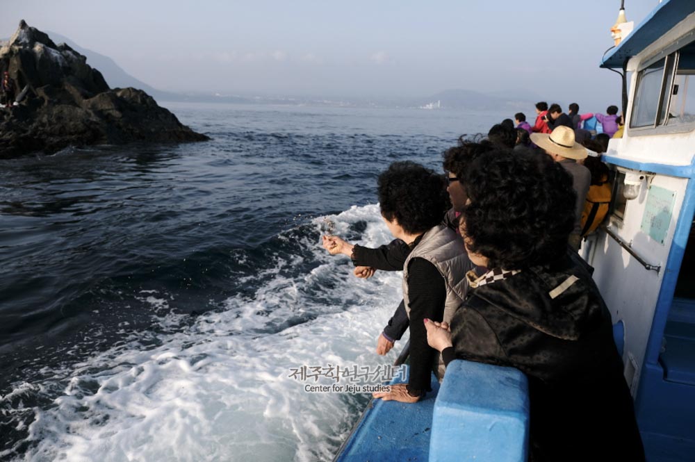[장면설명] 마을사람들이 배를 타고 바다로 나가 지드림과 씨드림 제차를 하는 모습이다. [공통설명] 영등굿은 해마다 음력 2월 초하루와 열나흘 사이에 제주도 해안가 마을의 당에서 영등신을 맞이하여 풍어 및 해상안전과 해녀들의 채취물인 소라‧전복‧미역 등의 풍성을 기원하는 굿이다. 주로 해녀 및 어업, 선박업자의 부녀자들을 중심으로 연행되는 영등굿은 봄을 맞는 문턱에서 행해지는 계절제로서의 의미가 있다. 영등굿은 내방신으로서 풍우신, 어업신, 해신, 해산물증식신 등으로 관념된다. 신명은 ‘영등’ 또는 ‘영등할망’이라 하고, 제명은 영등굿이라 한다. 굿에서는 ‘영등하르바님, 영등할마님, 영등 좌수(座首), 영등 벨감(別監), 영등 호장(戶長)’ 등 여러 관직명이 붙어 나와 영등신이 관속을 거느리고 오는 것으로 되어 있고, 제명도 마을에 따라 ‘영등맞이’, ‘영등손맞이’, ‘영등제’ 등으로 불려진다. 영등굿 신화로는 외눈박이나라설과 강남천자국설 두 가지가 전해지고 있다. “영등할망은 2월 초하루에 강남천자국 또는 외눈배기섬에서 구좌읍 우도로 제주도에 들어와서 바닷가를 돌면서 미역씨, 전복씨, 소라씨, 천초씨 등을 뿌려주어 해녀채취물을 풍성하게 해주고 14일에 다시 우도를 거쳐 본국으로 돌아간다.”는 이야기이다. 이 신앙은 제주도 뿐 아니라 한반도 일대에 분포하며, 그 신명은 ‘영등할만네·영등할맘·영등할마니·영등할마시·영등바람·풍신할만네·영등마고할마니’ 등으로 불리고 있으며 주로 풍신(風神)으로 신앙한다고 전해진다.