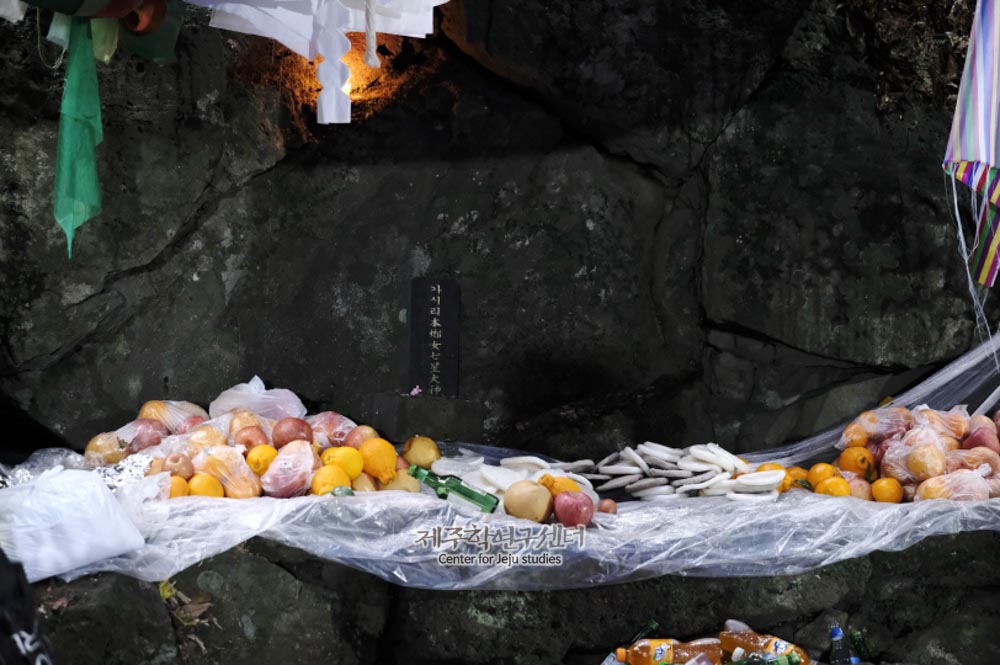 [장면설명] 가시리 본향 구석물당 제단에 제물을 진설한 모습이다. [공통설명] 신과세제는 마을의 본향당에서 매년 정월에 신에게 새해를 맞이하여 과세(過歲)를 드리는 의미로 벌이는 굿이다. 그 어원은 ‘신-’은 일반어휘와 구별하기 위하여 무속에서 흔히 덧붙이는 접두사이며 과세는 한자어 ‘過歲’로 과세문안(過歲問安)의 뜻이다. 가시리 본향 구석물당의 당신명은 ‘구석물 열뇌화주 삼천백메또, 일뤠당신’이다. 한라산계 산신, 토산계 신으로 다신합좌형 남녀 다수 신이 좌정한 형태이다. 직능은 생산(生産), 물고(物故), 호적(戶籍), 장적(帳籍)이다. 제일은 신과세제는 정월 그믐에 하고 초ᄋᆢ드레에 제를 지낸다. 당신으로 남신은 송당 당신계의 산신이고, 밖에 모신 여신은 토산리에서 가지 갈라다 모신 토산계의 일뤠할망인 듯하다.