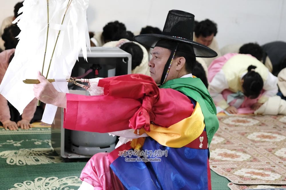 수산1리 본향 울레마루 하로산당 영등제(2019년) 오용부 심방이 초감제 중 신청궤 제차를 하는 모습