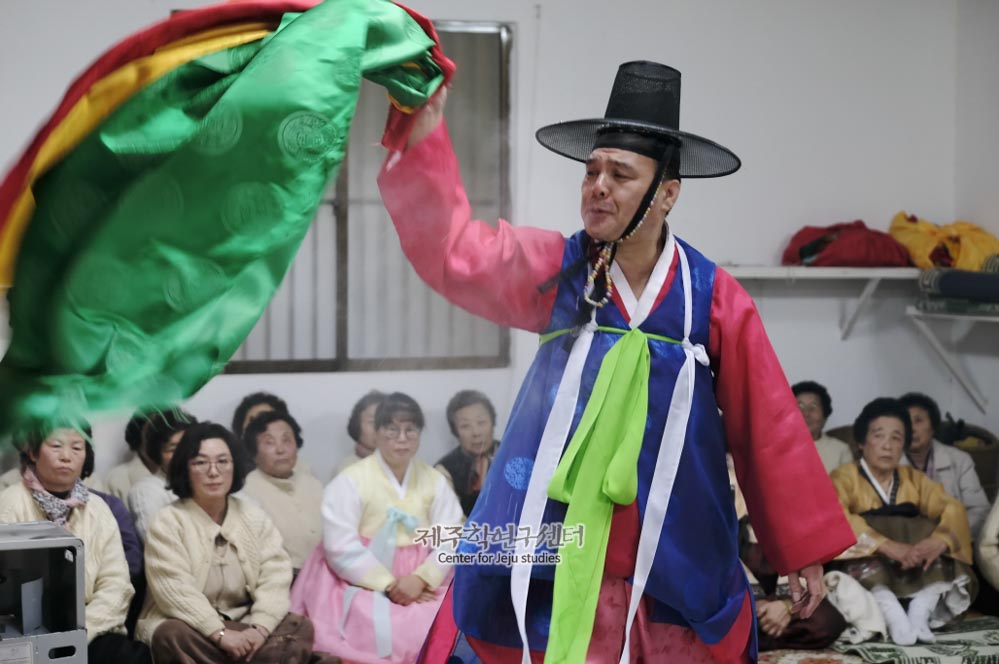 [장면설명] 오용부 심방이 초감제 중 신청궤 제차를 하는 모습이다. [공통설명] 수산1리 본향 울레마루 하로산당의 신명은 ‘하로산또’이다. 한라산계 산신으로 남신 하나 좌정한 형태로 독좌형이라고는 하지만 남신상과 여신상이 같이 좌정한 모습으로 있다. 직능은 생산(生産), 물고(物故), 호적(戶籍), 장적(帳籍)이다. 제일은 1월2일, 1월15일, 2월13일, 7월8일, 11월14일이다. 수산리, 고성리, 신양리 등 인근 여러 마을에서 함께 모시는 본향당신이다. 당신화는 “아방국은 종달리, 어멍국은 중국 대국에서 태어난 맹호부인이다. 하로산또는 한라산에서 내려오다 금백주를 만나 부부가 된다. 어느날 금백주는 목이 말라 물을 먹다가 돼지털이 코에 찔러 피가 났다. 하로산또는 금백주를 부정하다하여 마라도로 귀양을 보낸다. 하로산또는 요왕국으로 들어가 요왕국 말젯딸아기를 첩을 얻어 돌아온다. 작은부인은 큰부인이 마라도로 귀양을 간 것을 알고 데리러 간다. 작은부인은 큰부인이 낳은 일곱아기를 엎고 알송당으로 와 남편 하로산또를 찾는다. 이후 송당은 자식들에게 물려주고 수산리에 와서 좌정하였다.”고 한다. 영등굿은 해마다 음력 2월 초하루와 열나흘 사이에 제주도 해안가 마을의 당에서 영등신을 맞이하여 풍어 및 해상안전과 해녀들의 채취물인 소라‧전복‧미역 등의 풍성을 기원하는 굿이다. 주로 해녀 및 어업, 선박업자의 부녀자들을 중심으로 연행되는 영등굿은 봄을 맞는 문턱에서 행해지는 계절제로서의 의미가 있다. 영등굿은 내방신으로서 풍우신, 어업신, 해신, 해산물증식신 등으로 관념된다. 신명은 ‘영등’ 또는 ‘영등할망’이라 하고, 제명은 영등굿이라 한다. 굿에서는 ‘영등하르바님, 영등할마님, 영등 좌수(座首), 영등 벨감(別監), 영등 호장(戶長)’ 등 여러 관직명이 붙어 나와 영등신이 관속을 거느리고 오는 것으로 되어 있고, 제명도 마을에 따라 ‘영등맞이’, ‘영등손맞이’, ‘영등제’ 등으로 불려진다. 영등굿 신화로는 외눈박이나라설과 강남천자국설 두 가지가 전해지고 있다. “영등할망은 2월 초하루에 강남천자국 또는 외눈배기섬에서 구좌읍 우도로 제주도에 들어와서 바닷가를 돌면서 미역씨, 전복씨, 소라씨, 천초씨 등을 뿌려주어 해녀채취물을 풍성하게 해주고 14일에 다시 우도를 거쳐 본국으로 돌아간다.”는 이야기이다. 이 신앙은 제주도 뿐 아니라 한반도 일대에 분포하며, 그 신명은 ‘영등할만네·영등할맘·영등할마니·영등할마시·영등바람·풍신할만네·영등마고할마니’ 등으로 불리고 있으며 주로 풍신(風神)으로 신앙한다고 전해진다.