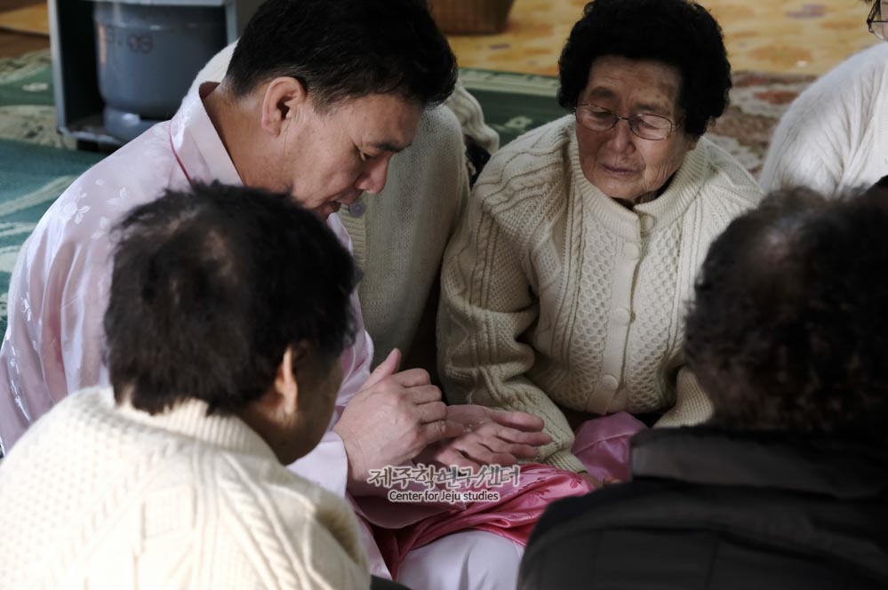[장면설명] 오용부 심방이 마을 사람들에게 제비점을 봐 주는 모습이다. [공통설명] 수산1리 본향 울레마루 하로산당의 신명은 ‘하로산또’이다. 한라산계 산신으로 남신 하나 좌정한 형태로 독좌형이라고는 하지만 남신상과 여신상이 같이 좌정한 모습으로 있다. 직능은 생산(生産), 물고(物故), 호적(戶籍), 장적(帳籍)이다. 제일은 1월2일, 1월15일, 2월13일, 7월8일, 11월14일이다. 수산리, 고성리, 신양리 등 인근 여러 마을에서 함께 모시는 본향당신이다. 당신화는 “아방국은 종달리, 어멍국은 중국 대국에서 태어난 맹호부인이다. 하로산또는 한라산에서 내려오다 금백주를 만나 부부가 된다. 어느날 금백주는 목이 말라 물을 먹다가 돼지털이 코에 찔러 피가 났다. 하로산또는 금백주를 부정하다하여 마라도로 귀양을 보낸다. 하로산또는 요왕국으로 들어가 요왕국 말젯딸아기를 첩을 얻어 돌아온다. 작은부인은 큰부인이 마라도로 귀양을 간 것을 알고 데리러 간다. 작은부인은 큰부인이 낳은 일곱아기를 엎고 알송당으로 와 남편 하로산또를 찾는다. 이후 송당은 자식들에게 물려주고 수산리에 와서 좌정하였다.”고 한다. 영등굿은 해마다 음력 2월 초하루와 열나흘 사이에 제주도 해안가 마을의 당에서 영등신을 맞이하여 풍어 및 해상안전과 해녀들의 채취물인 소라‧전복‧미역 등의 풍성을 기원하는 굿이다. 주로 해녀 및 어업, 선박업자의 부녀자들을 중심으로 연행되는 영등굿은 봄을 맞는 문턱에서 행해지는 계절제로서의 의미가 있다. 영등굿은 내방신으로서 풍우신, 어업신, 해신, 해산물증식신 등으로 관념된다. 신명은 ‘영등’ 또는 ‘영등할망’이라 하고, 제명은 영등굿이라 한다. 굿에서는 ‘영등하르바님, 영등할마님, 영등 좌수(座首), 영등 벨감(別監), 영등 호장(戶長)’ 등 여러 관직명이 붙어 나와 영등신이 관속을 거느리고 오는 것으로 되어 있고, 제명도 마을에 따라 ‘영등맞이’, ‘영등손맞이’, ‘영등제’ 등으로 불려진다. 영등굿 신화로는 외눈박이나라설과 강남천자국설 두 가지가 전해지고 있다. “영등할망은 2월 초하루에 강남천자국 또는 외눈배기섬에서 구좌읍 우도로 제주도에 들어와서 바닷가를 돌면서 미역씨, 전복씨, 소라씨, 천초씨 등을 뿌려주어 해녀채취물을 풍성하게 해주고 14일에 다시 우도를 거쳐 본국으로 돌아간다.”는 이야기이다. 이 신앙은 제주도 뿐 아니라 한반도 일대에 분포하며, 그 신명은 ‘영등할만네·영등할맘·영등할마니·영등할마시·영등바람·풍신할만네·영등마고할마니’ 등으로 불리고 있으며 주로 풍신(風神)으로 신앙한다고 전해진다.