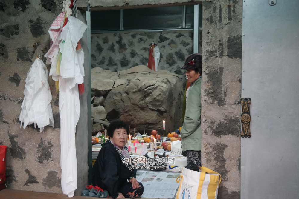 마을 주민들이 굿을 시작하기 전 제물을 진설하고 있는 모습이다.