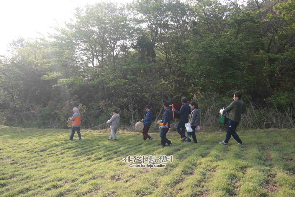 당오름 샘물머리에서 삼석울림 제차를 마치고 내려가는 모습이다.