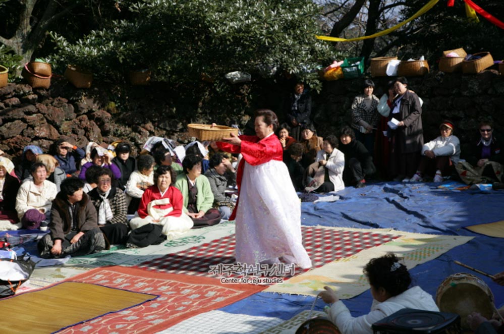 [장면설명] 이승순 심방이 초감제 중 도레둘레뷈 제차를 하는 모습이다. [공통설명] 신과세제는 마을의 본향당에서 매년 정월에 신에게 새해를 맞이하여 과세(過歲)를 드리는 의미로 벌이는 굿이다. 그 어원은 ‘신-’은 일반어휘와 구별하기 위하여 무속에서 흔히 덧붙이는 접두사이며 과세는 한자어 ‘過歲’로 과세문안(過歲問安)의 뜻이다. 송당리 본향 웃손당 당오름 백주할망당의 당신명은 ‘웃손당 금백주 할망’이다. 송당계 모신(母神)으로 좌정형태는 독좌형이고 여신 혼자 좌정한 형태이다. 직능은 생산(生産), 물고(物故), 호적(戶籍), 장적(帳籍)이다. 제일은 신과세제 음력 1월 13일, 영등손맞이 음력 2월 13일, 마불림제 음력 7월 13일, 시만곡대제 음력 10월 13일이다. 제물로는 육류를 쓰지 않는 것이 특징이다. 당신화의 내용은 “육지에서 들어온 백주또와 제주 태생 소로소천국이 부부가 되어 사는데 백주또의 권유로 농사를 짓게 된다. 어느날 소로소천국은 배가 고파 농사 짓던 소를 모두 잡아먹어버린다. 이 사실을 안 백주또가 화가 나서 별거를 하게 된다. 백주또와 소로소천국 사이의 자식들이 제주도 곳곳에 당신으로 좌정하게 된다.”는 이야기이다.