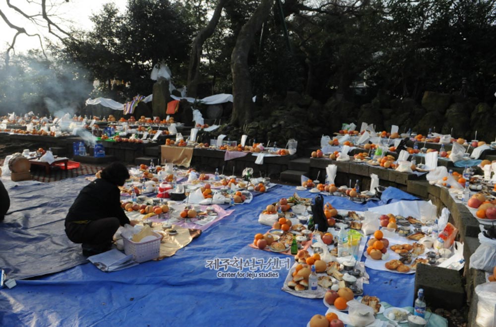 [장면설명] 와흘리 본향 한거리 하로산당 신과세제 제물을 진설한 전경이다. [공통설명] 신과세제는 마을의 본향당에서 매년 정월에 신에게 새해를 맞이하여 과세(過歲)를 드리는 의미로 벌이는 굿이다. 그 어원은 ‘신-’은 일반어휘와 구별하기 위하여 무속에서 흔히 덧붙이는 접두사이며 과세는 한자어 ‘過歲’로 과세문안(過歲問安)의 뜻이다. 와흘리 본향 한거리 하로산당의 당신명은 소로소천국 열쳇 아들 산신또, 서울 서정승 ᄄᆞ님애기이다. 송당계 산신과 외래계 산육신 계보로 좌정형태는 부부이좌형으로 남신, 여신 각각 하나씩 좌정해 있다. 직능은 생산(生産), 물고(物故), 호적(戶籍), 장적(帳籍)이다. 특별히 피부병과 육아에 대한 직능도 같이 가지고 있다. 제일은 신과세제 음력 1월 13일, 마불림제 음력 7월 13일이다. 당신화의 내용은 “송당리 백주또와 소로소천국 사이에 태어난 열 번째 아들로 옥황에 올라가 공부를 하고 내려와 좌정할 자리를 보다가 외대바지 선씨 하르방에게 와흘리 한거리 만년폭낭에 좌정한 신이 누구인지 묻고 서울 서정싱 ᄄᆞ님아기라는 말에 그곳에 찾아가 부부의 연을 맺고 좌정하게 되었다.”는 이야기이다.