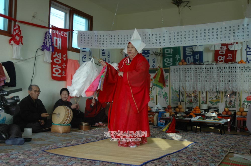 [장면설명] 김순아 심방이 초감제 중 신청궤 제차를 하는 모습이다. [공통설명] 영등굿은 해마다 음력 2월 초하루와 열나흘 사이에 제주도 해안가 마을의 당에서 영등신을 맞이하여 풍어 및 해상안전과 해녀들의 채취물인 소라‧전복‧미역 등의 풍성을 기원하는 굿이다. 주로 해녀 및 어업, 선박업자의 부녀자들을 중심으로 연행되는 영등굿은 봄을 맞는 문턱에서 행해지는 계절제로서의 의미가 있다. 영등굿은 내방신으로서 풍우신, 어업신, 해신, 해산물증식신 등으로 관념된다. 신명은 ‘영등’ 또는 ‘영등할망’이라 하고, 제명은 영등굿이라 한다. 굿에서는 ‘영등하르바님, 영등할마님, 영등 좌수(座首), 영등 벨감(別監), 영등 호장(戶長)’ 등 여러 관직명이 붙어 나와 영등신이 관속을 거느리고 오는 것으로 되어 있고, 제명도 마을에 따라 ‘영등맞이’, ‘영등손맞이’, ‘영등제’ 등으로 불려진다. 영등굿 신화로는 외눈박이나라설과 강남천자국설 두 가지가 전해지고 있다. “영등할망은 2월 초하루에 강남천자국 또는 외눈배기섬에서 구좌읍 우도로 제주도에 들어와서 바닷가를 돌면서 미역씨, 전복씨, 소라씨, 천초씨 등을 뿌려주어 해녀채취물을 풍성하게 해주고 14일에 다시 우도를 거쳐 본국으로 돌아간다.”는 이야기이다. 이 신앙은 제주도 뿐 아니라 한반도 일대에 분포하며, 그 신명은 ‘영등할만네·영등할맘·영등할마니·영등할마시·영등바람·풍신할만네·영등마고할마니’ 등으로 불리고 있으며 주로 풍신(風神)으로 신앙한다고 전해진다. 함덕리 본향 알카름 서물당의 당신명은 급허황하늘, 알카름 서물한집, 죽도남빌레일뤠한집, 뒷당동산 일뤠한집, 알질우의 요드레한집, 함덕역개(신흥) 열싀거리 삼천벵매으로 다신합좌형으로 좌정하여 있다. 신의 계보는 본향신, 일뤠신으로 보인다. 직능은 해녀와 어부를 관장한다. 제일은 서물날로 음력 매월 11일과 26일이다. 제물로는 돼지고기를 쓰지 않는다. 당신화는 “김첨지 하르방이 바다에 나가 낚시를 하는데 자꾸 미륵돌이 올라오니 이상하다 생각하고 다시 바다에 미륵돌을 던져놓고 왔다. 그 날 밤에 꿈에 요왕국 따님아기가 나타나 내가 그 미륵돌이라고 하고 자신을 알카름 폭낭 아래에 잘 모시면 어선, 잠수들을 돌아주겠다고 한다. 김첨지는 그 미륵돌을 모셔다 당신으로 모셨다.”고 전해지고 있다.