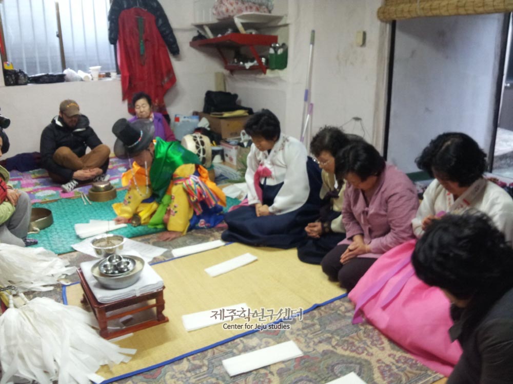 온평리 본향 진동산당 신과세제(포제굿)(2015년) 고덕유 심방이 초감제 중 신청궤에서 자손역가‧소지원정 제차를 하는 모습