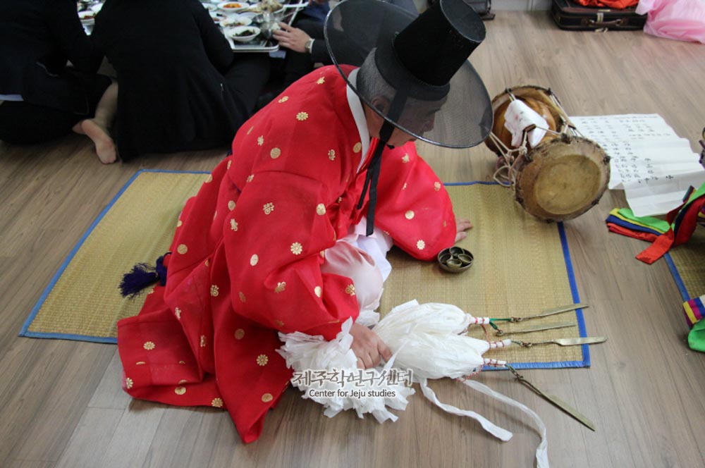 [장면설명] 홍보원 심방이 초감제 중 산받음 제차를 하는 모습이다. [공통설명] 영등굿은 해마다 음력 2월 초하루와 열나흘 사이에 제주도 해안가 마을의 당에서 영등신을 맞이하여 풍어 및 해상안전과 해녀들의 채취물인 소라‧전복‧미역 등의 풍성을 기원하는 굿이다. 주로 해녀 및 어업, 선박업자의 부녀자들을 중심으로 연행되는 영등굿은 봄을 맞는 문턱에서 행해지는 계절제로서의 의미가 있다. 영등굿은 내방신으로서 풍우신, 어업신, 해신, 해산물증식신 등으로 관념된다. 신명은 ‘영등’ 또는 ‘영등할망’이라 하고, 제명은 영등굿이라 한다. 굿에서는 ‘영등하르바님, 영등할마님, 영등 좌수(座首), 영등 벨감(別監), 영등 호장(戶長)’ 등 여러 관직명이 붙어 나와 영등신이 관속을 거느리고 오는 것으로 되어 있고, 제명도 마을에 따라 ‘영등맞이’, ‘영등손맞이’, ‘영등제’ 등으로 불려진다. 영등굿 신화로는 외눈박이나라설과 강남천자국설 두 가지가 전해지고 있다. “영등할망은 2월 초하루에 강남천자국 또는 외눈배기섬에서 구좌읍 우도로 제주도에 들어와서 바닷가를 돌면서 미역씨, 전복씨, 소라씨, 천초씨 등을 뿌려주어 해녀채취물을 풍성하게 해주고 14일에 다시 우도를 거쳐 본국으로 돌아간다.”는 이야기이다. 이 신앙은 제주도 뿐 아니라 한반도 일대에 분포하며, 그 신명은 ‘영등할만네·영등할맘·영등할마니·영등할마시·영등바람·풍신할만네·영등마고할마니’ 등으로 불리고 있으며 주로 풍신(風神)으로 신앙한다고 전해진다.