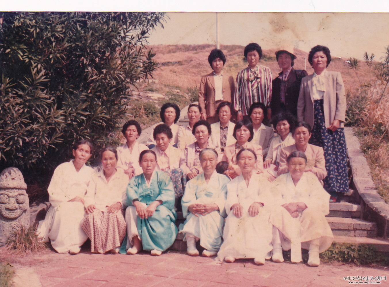 수산리 당동 어머님들과 어버이날 기념으로 제주도 일주 여행에 나섰을 때 모습이다. 전경순 씨는 사진 속 장소를 기억하지 못하였지만 한복을 곱게 차려입은 당동 어머님들을 모시고 여행 다녔던 날이 즐거웠다고 한다.