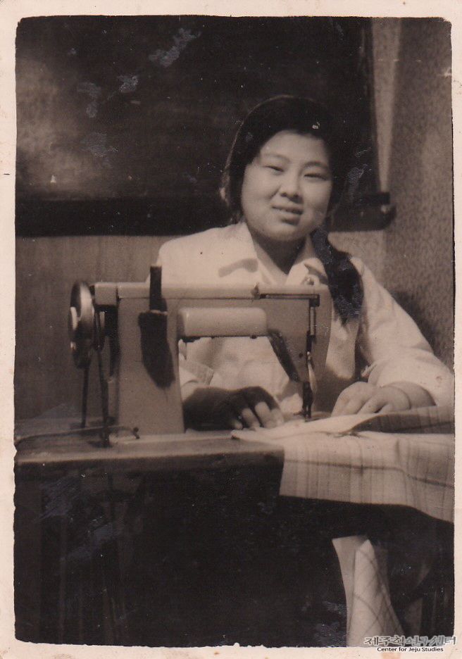 강군자 씨는 17세 때 고향 제주를 떠나 부산의 미싱 공장에서 근무하였다고 한다. 사진 속 강군자 씨는 재봉틀 앞에 앉아 작업하던 중 카메라를 바라보며 밝은 미소를 짓고 있다. 당시 강군자 씨는 공장에서 받은 월급을 제주에 있는 친정으로 보내어 생활비를 보조하였다고 한다. 촬영된 시기는 1956~1960년 사이로 추정하고 있다.