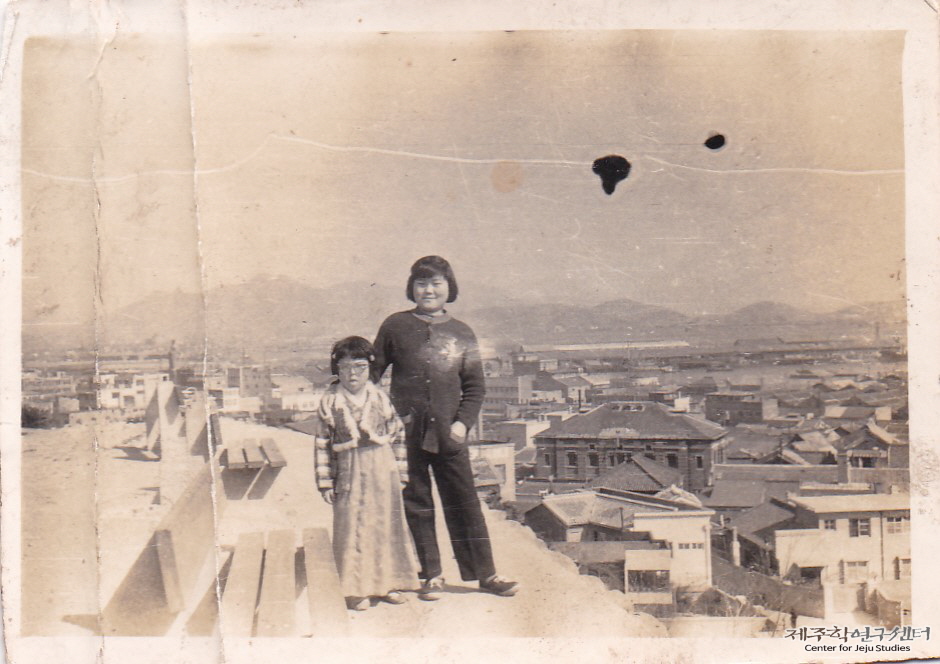 박송자 씨가 어릴 적 제주를 떠나 부산에 있는 한 방직 공장에 다니던 때 용두산공원으로 나들이를 간 기념으로 남긴 사진이다. 박송자 씨(사진 오른편, 당시 19세)는 단발머리를 하고 짙은 색 가디건과 바지를 입고 있다. 그 곁에 선 아이는 공원에서 만난 행인이라고 한다. 한편 그들 뒤편으로 부산항과 부산 시가지의 전경이 펼쳐져 있어 1960년대 부산의 모습도 볼 수 있다.