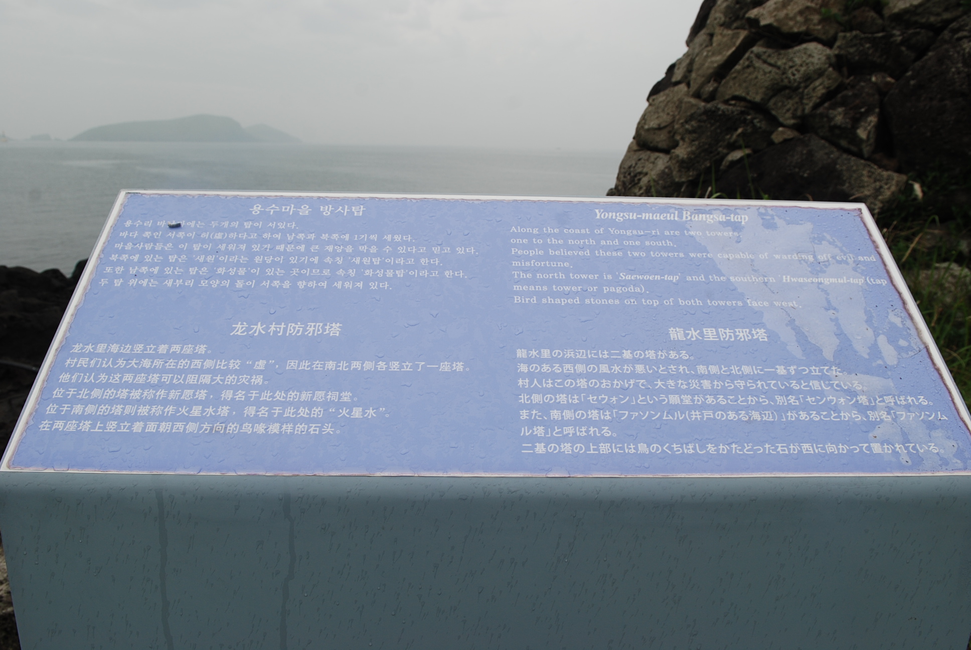 ․ 용수리포구 북편 화성물에 세워져 있다. 이곳은 조류 등의 영향으로 바다에서 죽은 시신이 자주 떠오르는 일이 많았다. 이에 마을 주민들은 바다가 위치하는 마을 서쪽의 기운이 허하여 시신이 떠오르는 것으로 여겨 방사탑을 쌓은 것이다.