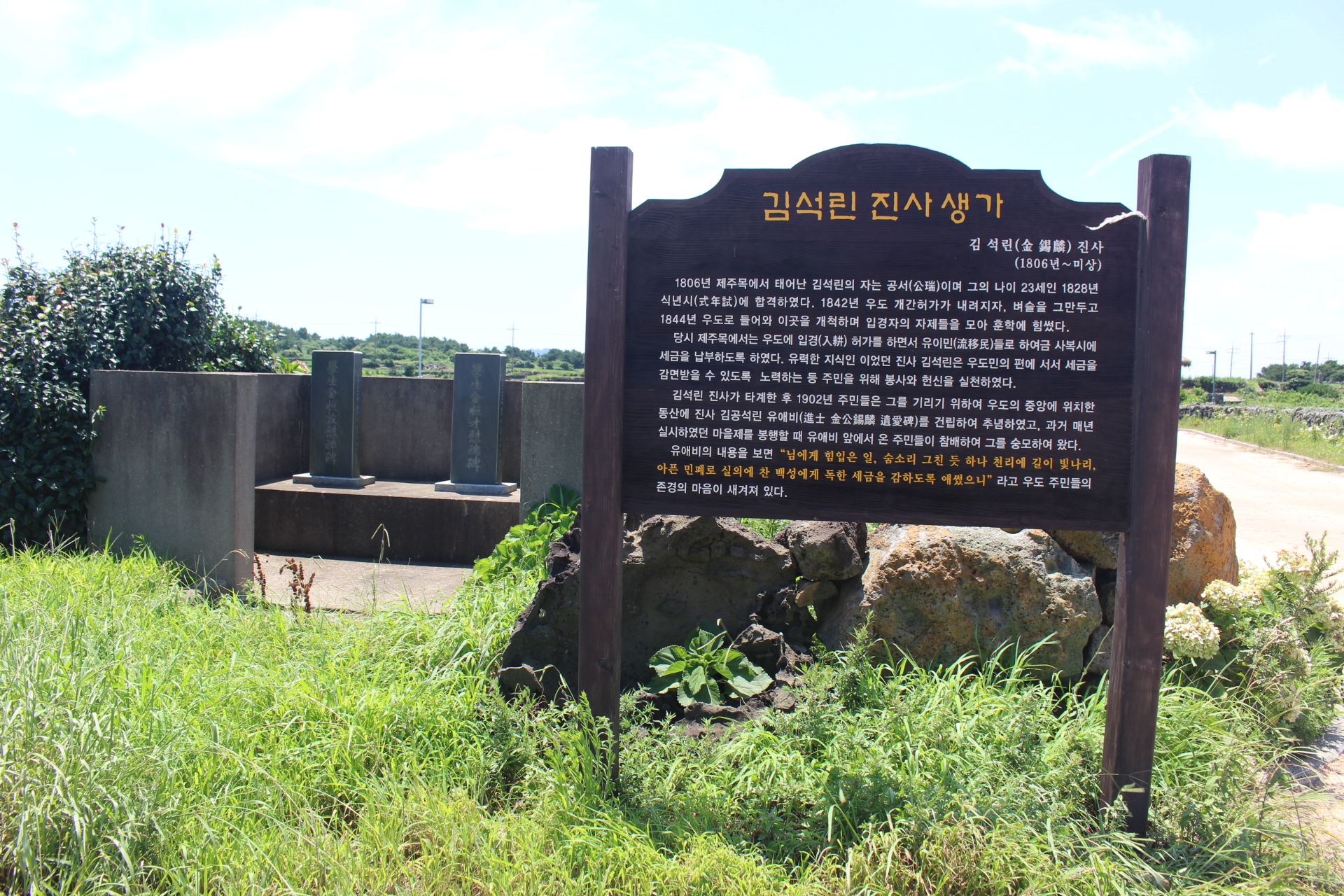 1806년 제주목에서 태어난 김석린의 자는 공서(公瑞)이며 그의 나이 23세인 1828년 식년시(式年試)에 합격하였다. 1842년 우도 개간허가가 내려지자, 벼슬을 그만두고 1844년 우도로 들어와 이곳을 개척하여 입경자의 자제들을 모아 훈학에 힘썼다.
