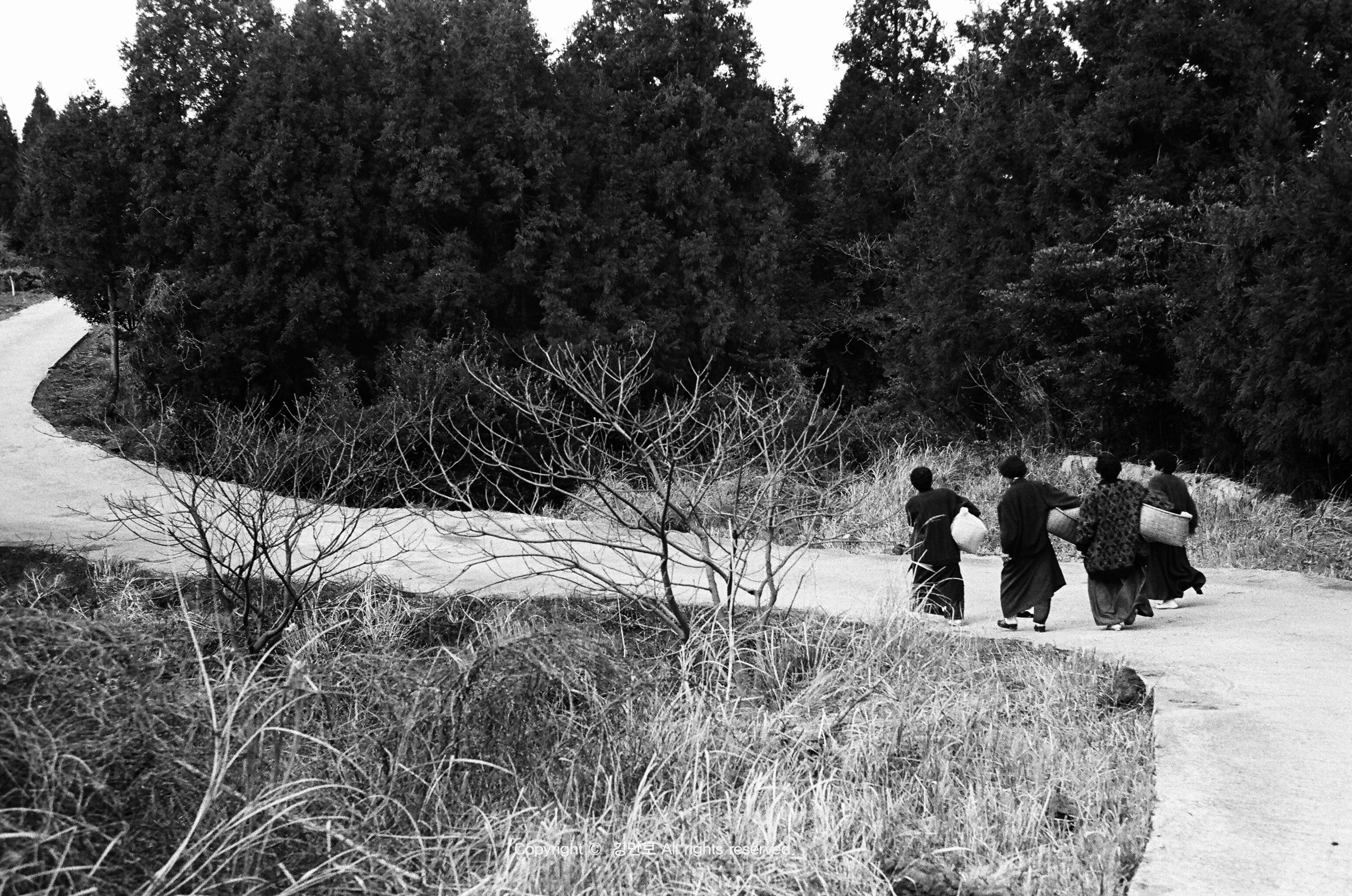제물을 넣고 가서 신에게 바친 후, 빈 구덕을 가볍게 들고 내려 가는 제주 여성들