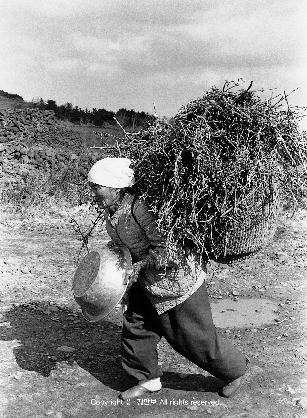 땔감을 등에 지고 길을 가는 할머니의 모습, 큰 망태에 콩타작을 해서 곡식을 떨고 남은 콩줄기나, 깨의 대 등은 집으로 들여와 땔감으로 사용되었다.