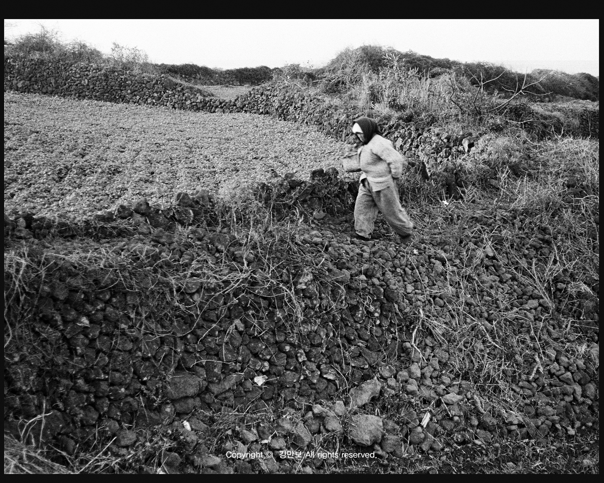 밭으로 가기 위해 잣담길을 걷고 있다. 길과 인근되지 않은 밭은 자갈돌을 이용하여 성처럼 쌓았는데 이를 잣담이라고 한다.