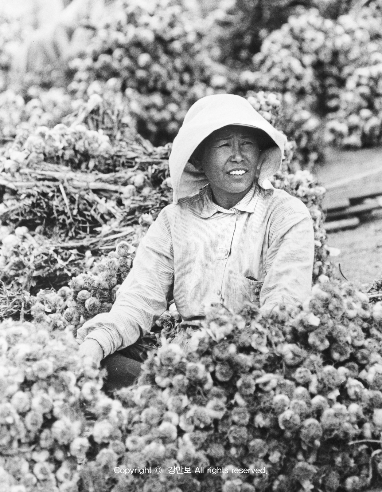마늘 파는 아낙네 옆에는 수확을 마친 후 잘 말린 마을이 다발로 묶였다. 한 다발을 접이라고 하는데, 보통 100개의 마늘이 한 묶음으로 묶여진다.