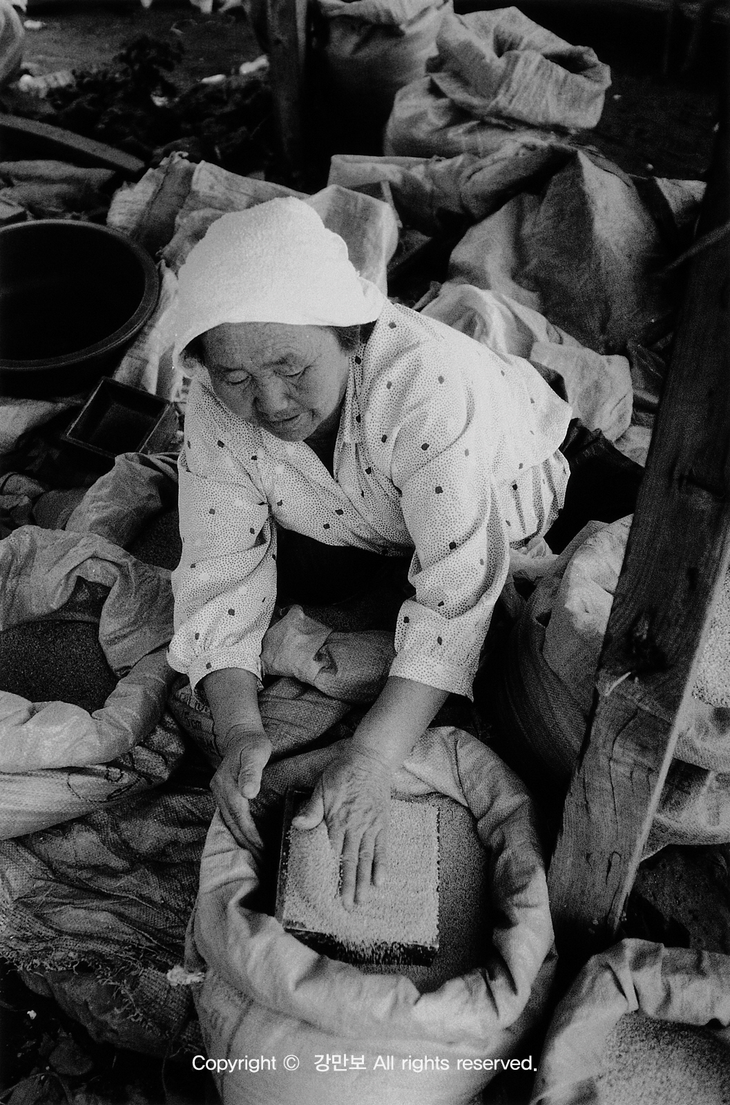 곡물을 팔 때 일반적으로 사용되는 됫박은 양을 재는 도구였다. 쌀을 담아서 넘치지 않도록 잘 손바닥으로 쓰는 것이 장사꾼에게 중요하다.