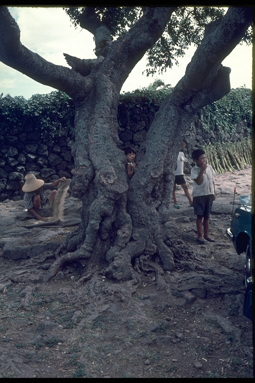 * 개요 : 굵은 줄기가 양 갈래로 뻗어 있는 폭낭(팽나무)에서 아이들이 놀고 있다. 딱히 놀이터가 없는 시절이라 이런 거목도 아이들에게는 놀이도구로서 이용될 것이다. 오르기도 하고 숨박꼭질도 하고 거목 주위를 빙빙 돌며 술레잡기도 할 수 있을 게다. 한 여자 아이가 양 갈래로 뻗은 사이에 끼어 들어가 있다. 무슨 장난을 하고 있는 것일까. 그 옆에 한 아주머니가 ‘ᄌᆞᆷ팍’으로 보리를 불리고 있다. 돌담 위에는 덩굴줄기가 뻗어 넘어오고 돌담에 말리는 참깨가 세워졌다. 오후 농가 마을의 일상적 모습으로 보인다.
