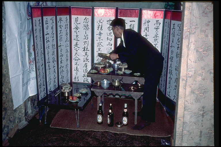 * 개요 : 1971년 10월 3일은 개천절이자 추석날이었다. 양천허씨 문중의 추석상차림이다. 조상신위는 세 분이다. 제수로는 메 3개, 고기산적․전․생선을 함께 올린 쟁반 3개, 튀김 쟁반 3개, 떡 쟁반 3개, 사과와 감을 올렸다. 자손이 갱을 올리고 있다. 문전상이 왼쪽에 차려져 있다.