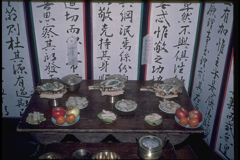 * 개요 : 1971년 10월 3일은 개천절이자 추석날이었다. 양천허씨 문중의 추석상차림이다. 조상신위는 세 분이다. 제수로는 메 3개, 고기산적․전․생선을 함께 올린 쟁반 3개, 튀김 쟁반 3개, 떡 쟁반 3개, 사과와 감을 올렸다.