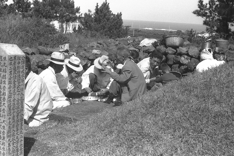 * 개요 : 1971년 추석 전에 양천허씨 문중의 사람들이 묘의 비석을 건립하여 묘제를 행하고 난 후 음복을 하고 있다. 허씨 문중묘는 소나무밭이 우거진 ‘서운당’이라는 도남동에 있었다. 중절모를 쓰고 흰 한복을 입거나 양복 차림의 장노년층 남자들이 많이 모여 있다. 왼쪽 소나무 사이로 보이는 건물은 1970년 11월 신축 이전한 신성여자중학교이다. 이후 허씨 문중묘는 해안동으로 이전하였고, 현재 이곳은 주택과 아파트, 상가가 빽빽이 들어서서 도시화가 되었다.