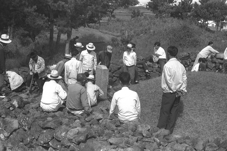 * 개요 : 1971년 추석 전에 양천허씨 문중의 사람들이 묘비를 건립하고 묘제를 행하려고 준비하고 있다. 허씨 문중묘는 소나무밭이 우거진 ‘서운당’이라는 도남동에 있었다. 중절모를 쓰고 흰 한복을 입거나 양복 차림의 장노년층 남자들이 많이 모여 있다. 한 여자분이 구덕에서 무언가를 만지고 있다. 당시에는 물건을 담고 나르기 위해 구덕을 많이 이용했다. 이후 허씨 문중묘는 해안동으로 이전하였고, 현재 이곳은 주택과 아파트, 상가가 빽빽이 들어서서 도시화가 되어 있다.