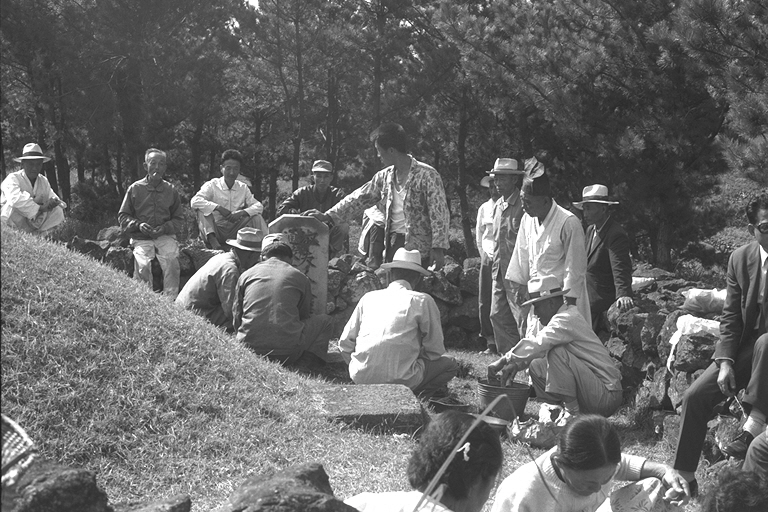 * 개요 : 1971년 추석 전에 양천허씨 문중의 사람들이 묘비를 건립하고 묘제를 행하기 위해 모여 있다. 허씨 문중묘는 소나무밭이 우거진 ‘서운당’이라는 도남동에 있었다. 중절모를 쓰고 흰 한복을 입거나 양복 차림의 장노년층 남자들이 많이 모여 있다. 이후 허씨 문중묘는 해안동으로 이전하였고, 현재 이곳은 주택과 아파트, 상가가 빽빽이 들어서서 도시화가 되었다.