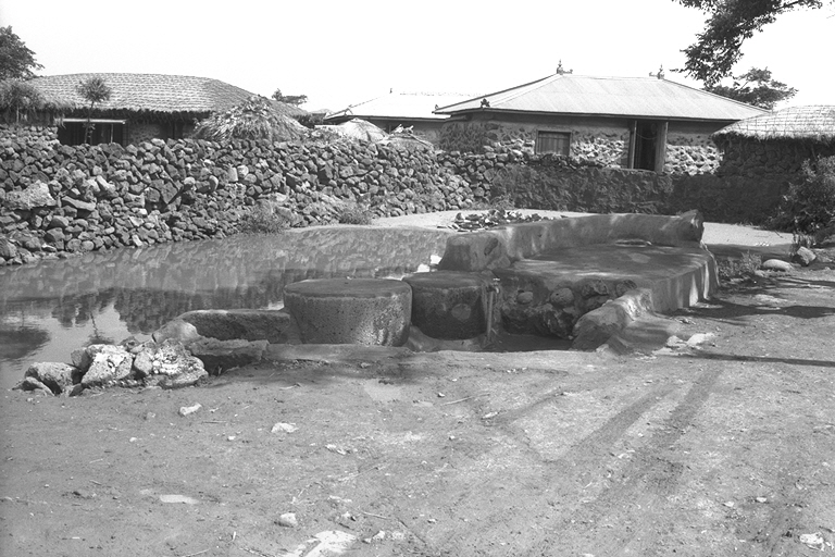* 개요 : 집집마다 수도가 없던 시절 마을 사람들은 공동 간이수도를 이용했다. 부녀자와 여자 아이들은 공동 간이수도에서 물허벅(항아리)에 물을 길어 구덕에 넣어 등에 짊어져 부엌의 물항아리로 물을 옮겨 채워 놓았다. 간이수도 옆에 설치된 말방아로 이용했던 돌과 돌을 쌓아 시멘트로 단장한 댓돌은 물구덕을 짊어질 때 받침대로 이용하거나 물허벅에 물이 채워질 동안 잠시나마 부녀자들이 앉아서 이야기하며 쉬는 용도로 사용되었다. 1971년 당시 오라1동 마을에는 8개의 공동 간이수도가 설치되어 있었고, 간이수도를 둘러싼 돌담 안으로 초가집과 함석 지붕이 보인다. 당시 초가집이 대부분이었는데 함석 지붕집이 3군데 있었다고 한다.