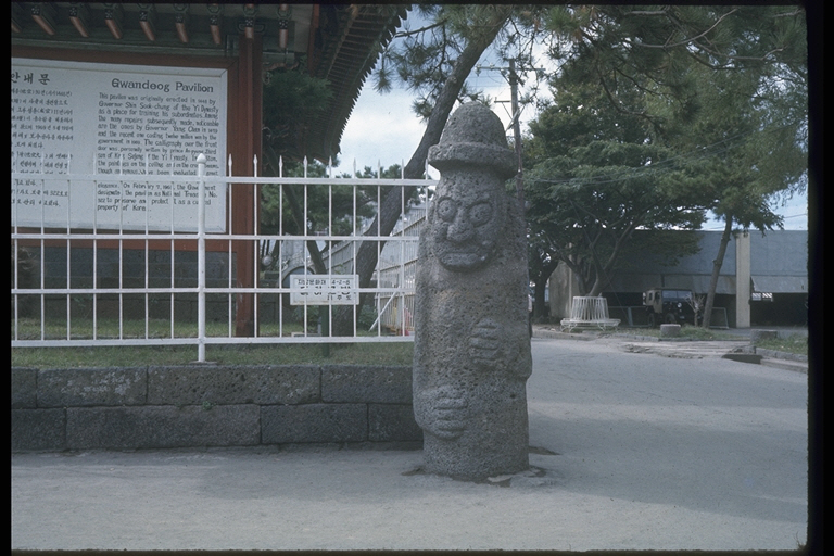 * 개요 : 관덕정 앞 북쪽에 세워진 돌하르방이다. 돌하르방은 제주특별자치도 민속자료 제2호이며 조선시대 제주목 성문 앞에 세워졌던 석상이다. ‘우석목’, ‘무석목’, ‘옹중석’ 으로도 불리는 돌하르방은 성문 입구에 서로 마주보게 배치되어 마을의 평안과 융성을 지켜주는 수호신적 기능, 사악한 것을 막는 주술 종교적 기능, 성안과 밖을 나누는 경계 구분, 성문 출입을 제한하는 위치 표지 및 금지 표시 등의 기능이 있었다고 보고 있다. 제주현·정의현·대정현 등 지역에 따라 조금씩 크기나 모습에 차이가 있지만, 머리에 꼭 끼는 벙거지 모자, 부리부리한 왕방울 눈, 몽툭한 주먹코, 굳게 다문 입, 배 부분에 가지런히 모아 붙인 손 모습 등은 공통적인 모습이다. 제주도 특유의 해학과 풍자스런 분위기를 풍기는 조각물로서 오늘날 제주의 대표적인 상징물 중 하나이다.