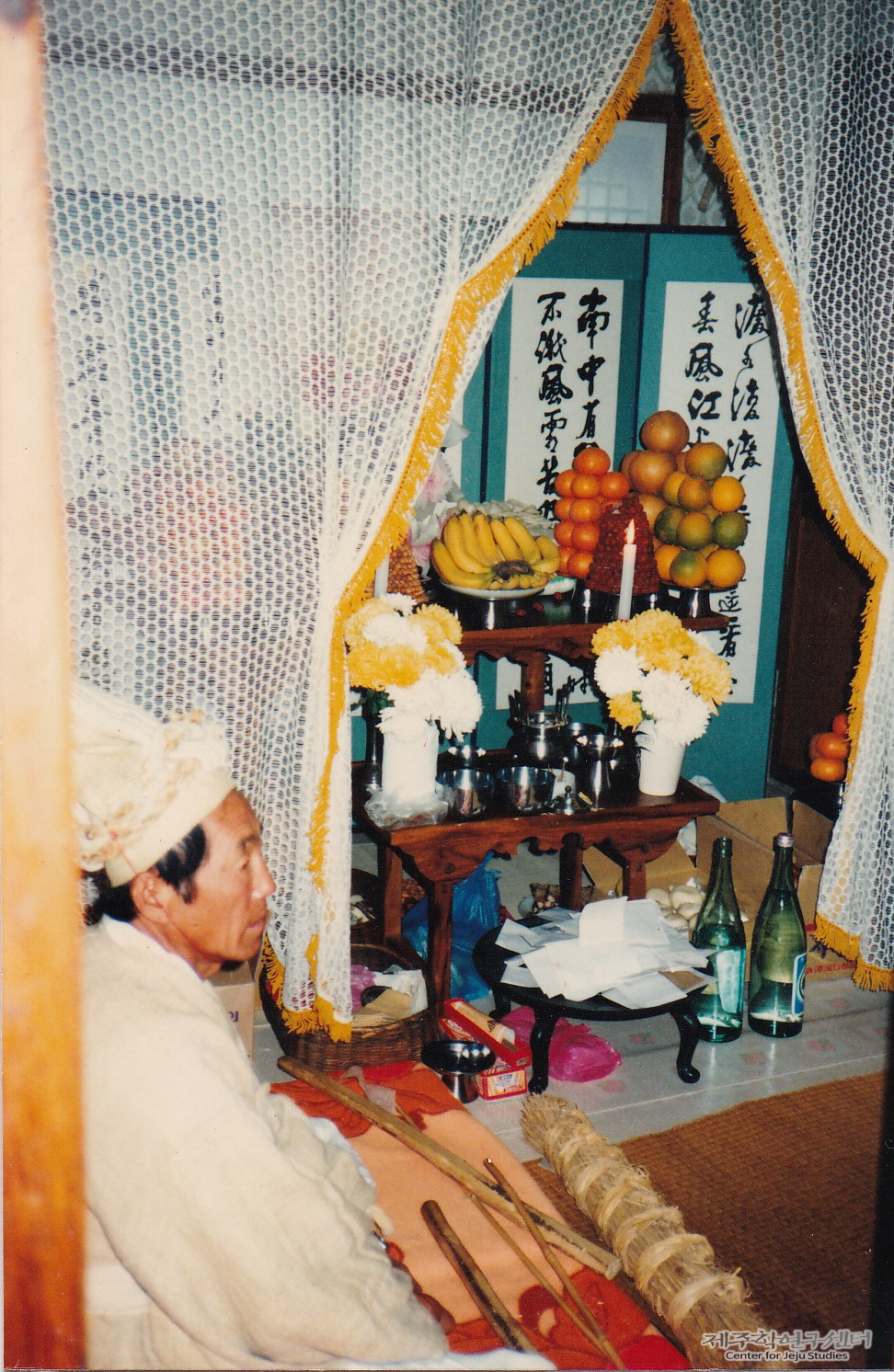 소장자 강남승 씨 모친 장례에서 모친 장례상 앞에서 조문객을 맞는 상주 모습이다. 상주는 거친 삼베로 만든 상복을 입고 있으며 머리엔 상관을 두른 두건을 쓰고 있다. 또 그 앞에는 일곱 묶음으로 묶인 짚담과 가시나무로 만든 방장대가 놓여 있다. 한편 상 앞에는 조문객들이 건넨 제물, 부조 봉투와 한 되짜리 대형 소주병이 제주(祭酒)로 올려졌다. 갖은 과일, 떡, 향로와 꽃, 술잔 등 상에 올렸다. 강남승 씨 설명에 따르면 '문전신'을 대접하는 '문전상'은 모친상 오른쪽에 따로 차렸다고 한다.