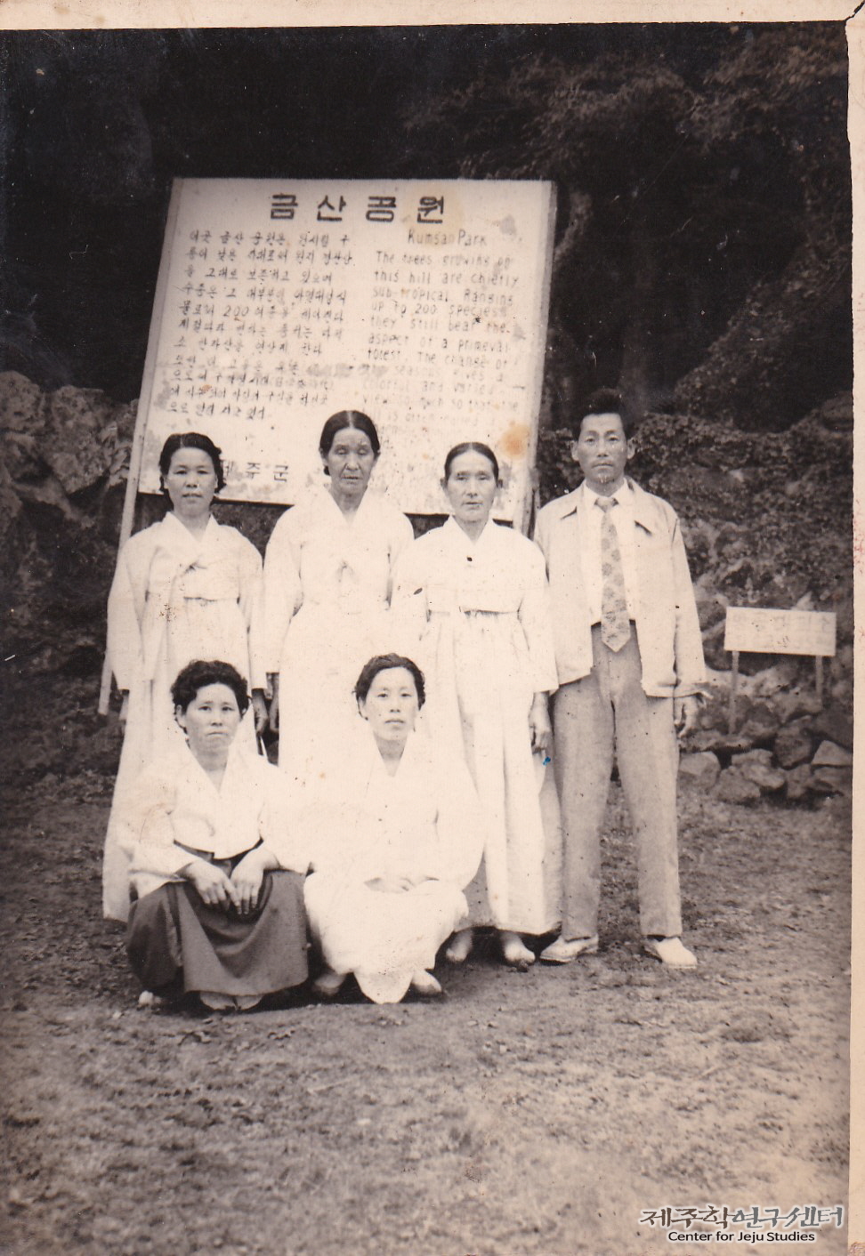 이날 소장자 강남승 씨와 가족들은 당일치기로 도내를 여행하던 도중 금산공원을 방문하였다. 뒷줄 왼쪽부터 고모님 며느리, 둘째 고모, 막내 고모 그리고 강남승 씨가 서 있고, 앞줄은 강남승 씨 아내와 고모님이 앉아 있다. 당시까지만 하더라도 야유회를 가는 날이면 여성은 한복을 깨끗하게 손질하여 입고 다녔다. 그들 주변엔 금산공원 안내판이 세워져 있다.
