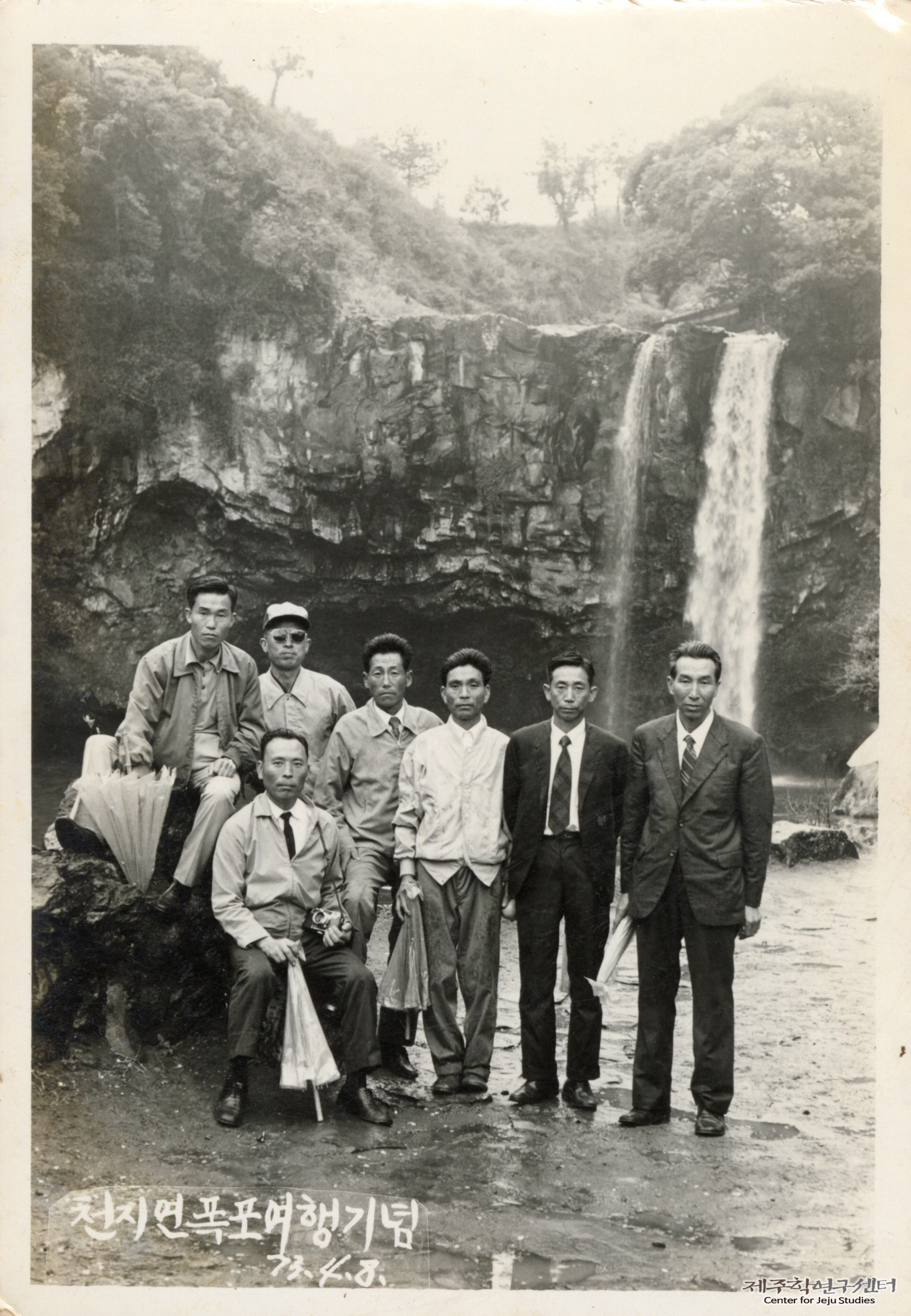 마을 부부 동반 야유회 때 서귀포시 천지연폭포 앞에서 강남승 씨와 마을 청장년이 모여 촬영한 사진이다. 소장자 강남승 씨 설명에 따르면 이날도 오랜 봄가뭄 끝에 비가 내려 폭포를 보았다고 한다. 사진 왼편 하단에 '천지연폭포여행기념 73. 4. 8.'이라고 적혀있다.