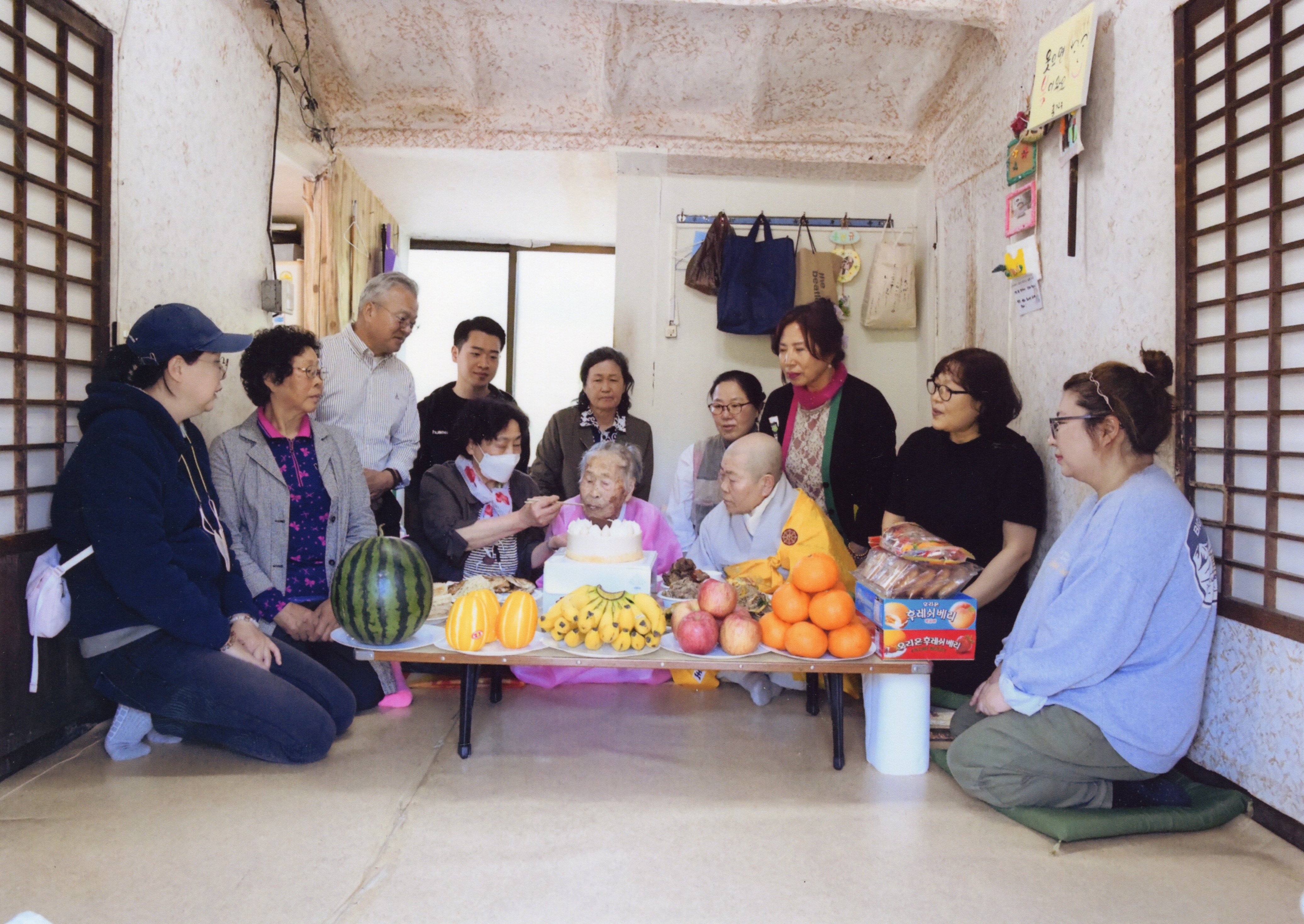 송옥자 씨의 시어머니(1918년생, 사진 아래 중앙)의 106세 생신을 축하하는 잔치 기념 사진이다. 어머니의 장수를 기념하기 위하여 온 가족이 모였다. 특히 이날 월평동 영암사 스님이 잔칫상을 차려 대접하였다. 한편 시어머니 옆에 앉은 큰딸이 잔치 음식을 어머니 입에 넣어드리고 있다.