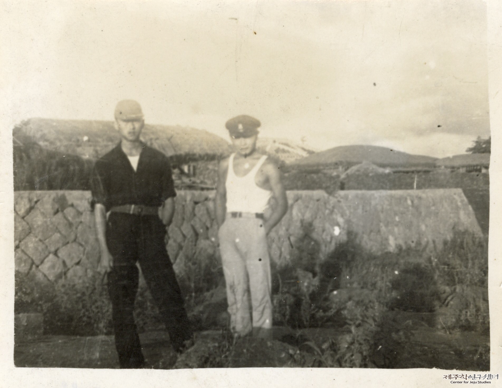김원출 씨 남편 강성호 씨(왼쪽)가 고등학교에 다닐 시절 마을 친구와 함께 애월읍 수산리 '한길(큰길)'에서 촬영한 사진이다. 길가엔 정비하지 않은 나무들이 무성하게 우거져 있다. 또 당시에는 인물 뒤로 보이는 초가처럼 옛 가옥이 많이 있었고 견치석 모양으로 겹겹이 쌓아올린 '돌담'도 보이고 있다.