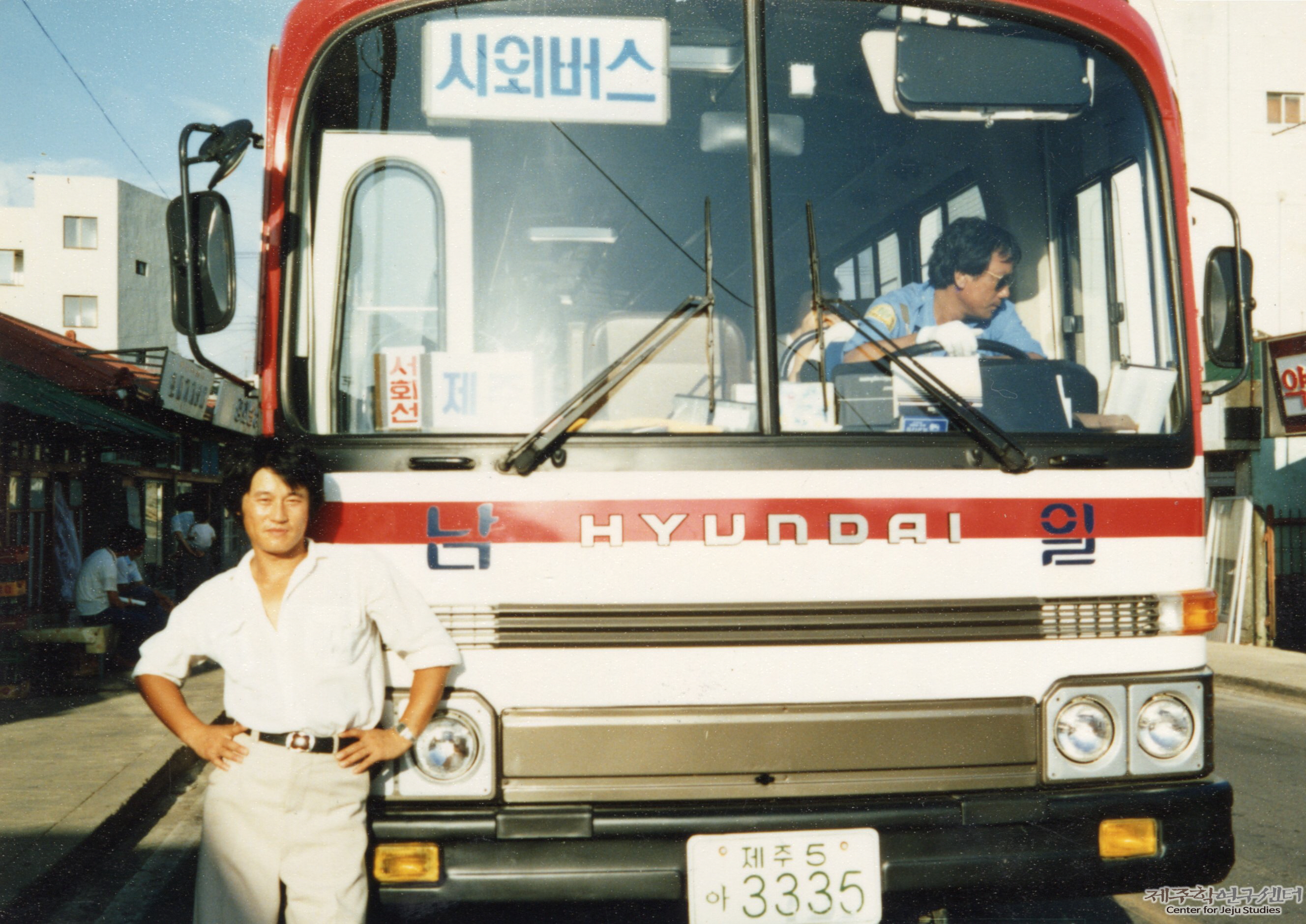 소장자 강옥순 씨의 남편 양덕중 씨가 남일여객 버스 기사로 근무하던 당시 운전석에 앉아 있는 모습이다. 그는 기사복을 입고 썬글라스를 낀 채 운전석에 앉아 있다. 남편은 1980년대 중반 남일여객에 입사하여 시외버스와 시내버스를 운전하였고 15년 넘도록 근무하였다고 한다. 남일여객은 1980년대 중반부터 1990년대까지 버스를 제주에서 운영하던 업체로 중산간 마을까지 운행하였다고 한다.