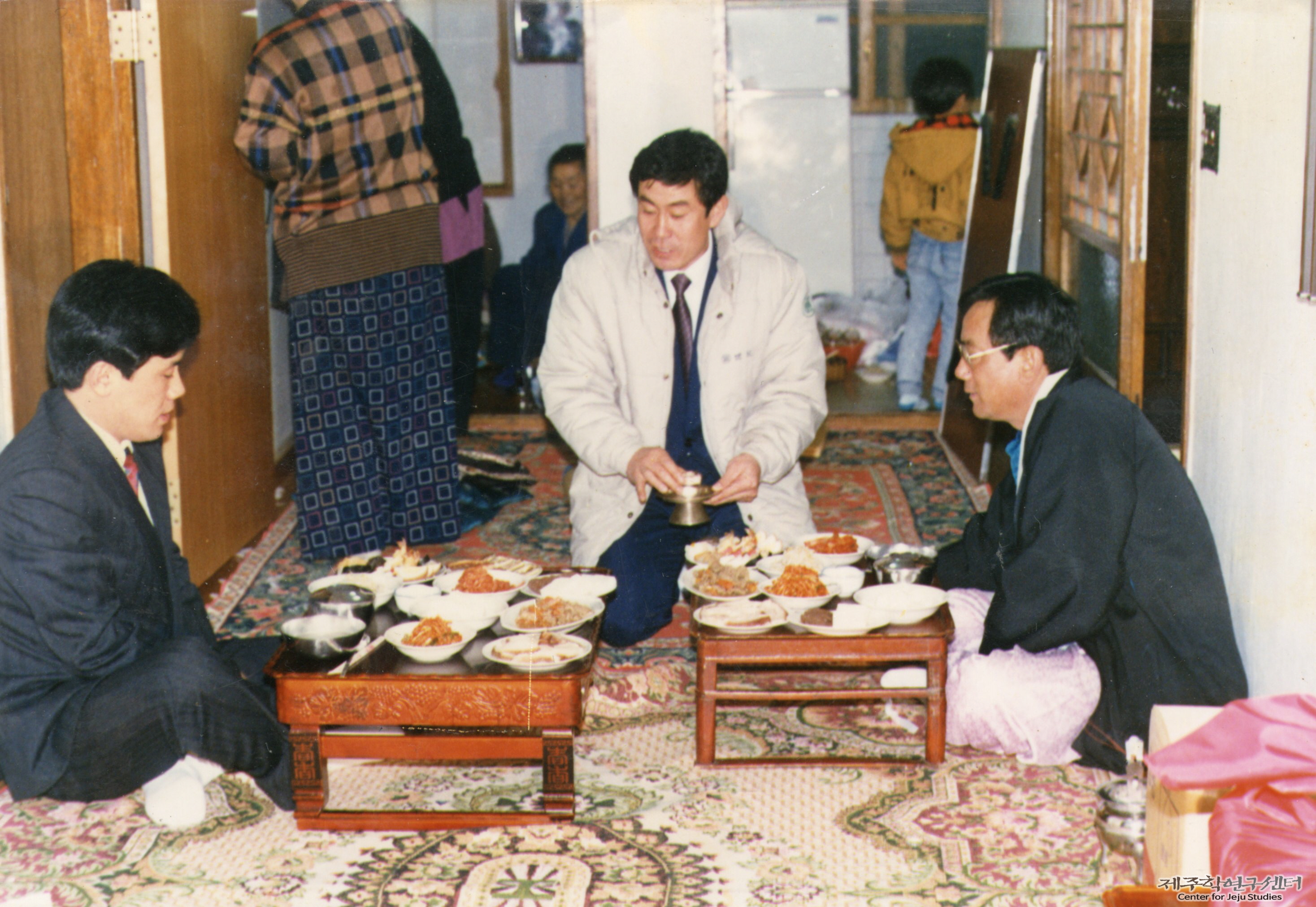 큰아들의 결혼식 당일 아침 모습으로 '문전제'를 끝내고 큰아들(사진 왼편)과 남편(사진 오른편)이 마주 앉아 덕담을 나누는 모습이다. 다과상에는 각종 과일, 돼지고기, 김치, 수육, 두부와 순대, 흰밥 등으로 상차림하였다. 그들 곁에서 시댁 조카가 술잔을 들고 있다.
