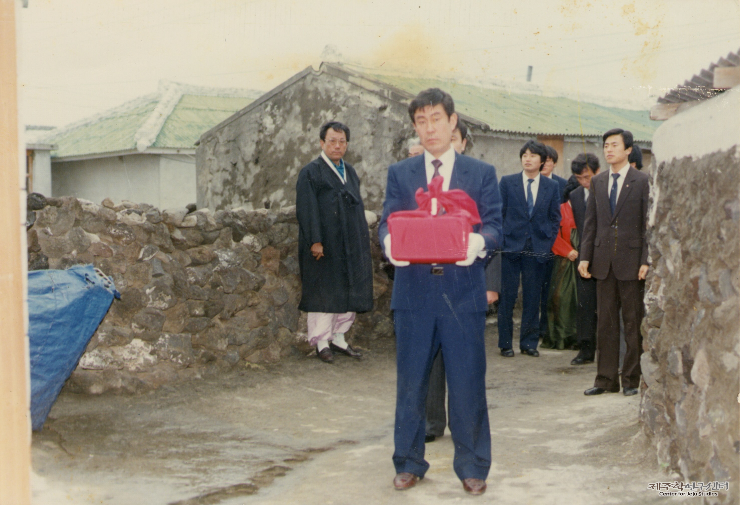 큰아들의 결혼식 날 시댁 조카가 '홍세함'을 들고 사돈집 골목으로 들어서는 사진이다. 그 뒤로 신랑인 큰아들이 뒤따르고 있으며 남편(사진 왼편)이 한복 차림 위에 검은 두루마기를 입고 서 있다. 당시 '홍세함'에는 '시렁목(얇고 성글게 짠 면직물)', '미녕(무명)' 각 한 필, '예장'을 넣고 빨간색 보자기로 싼 후 무명실로 묶었다고 한다.