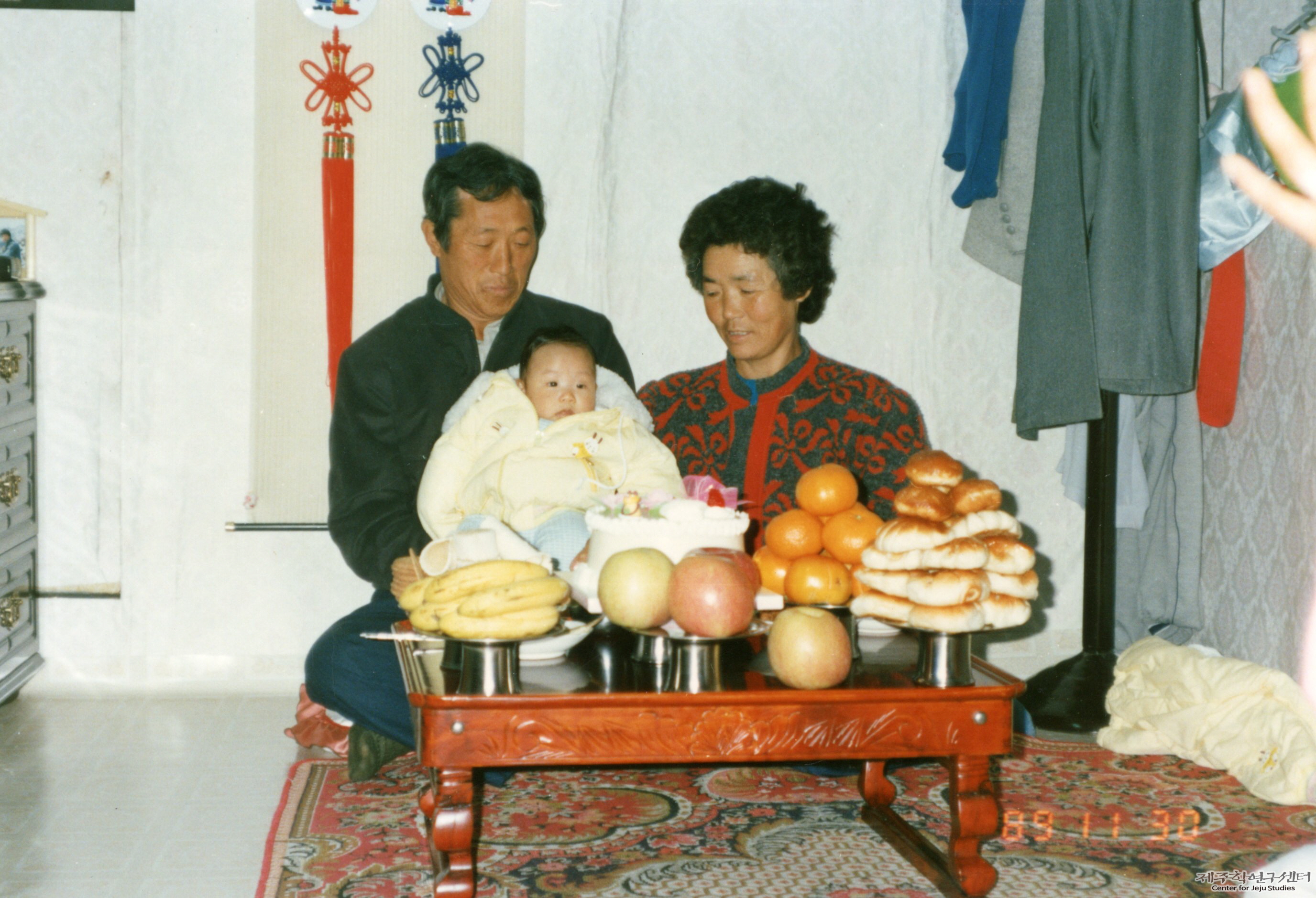 소장자 양용규 씨 부부가 큰아들의 첫 손주 백일을 맞아 애월읍 수산리 자택에서 이를 기념하여 촬영한 사진이다. 사진 가운데는 부부와 손주가 앉아 있고 그 앞엔 백일상이 단팥빵, 케이크, 사과, 귤, 바나나 등이 차려졌다.