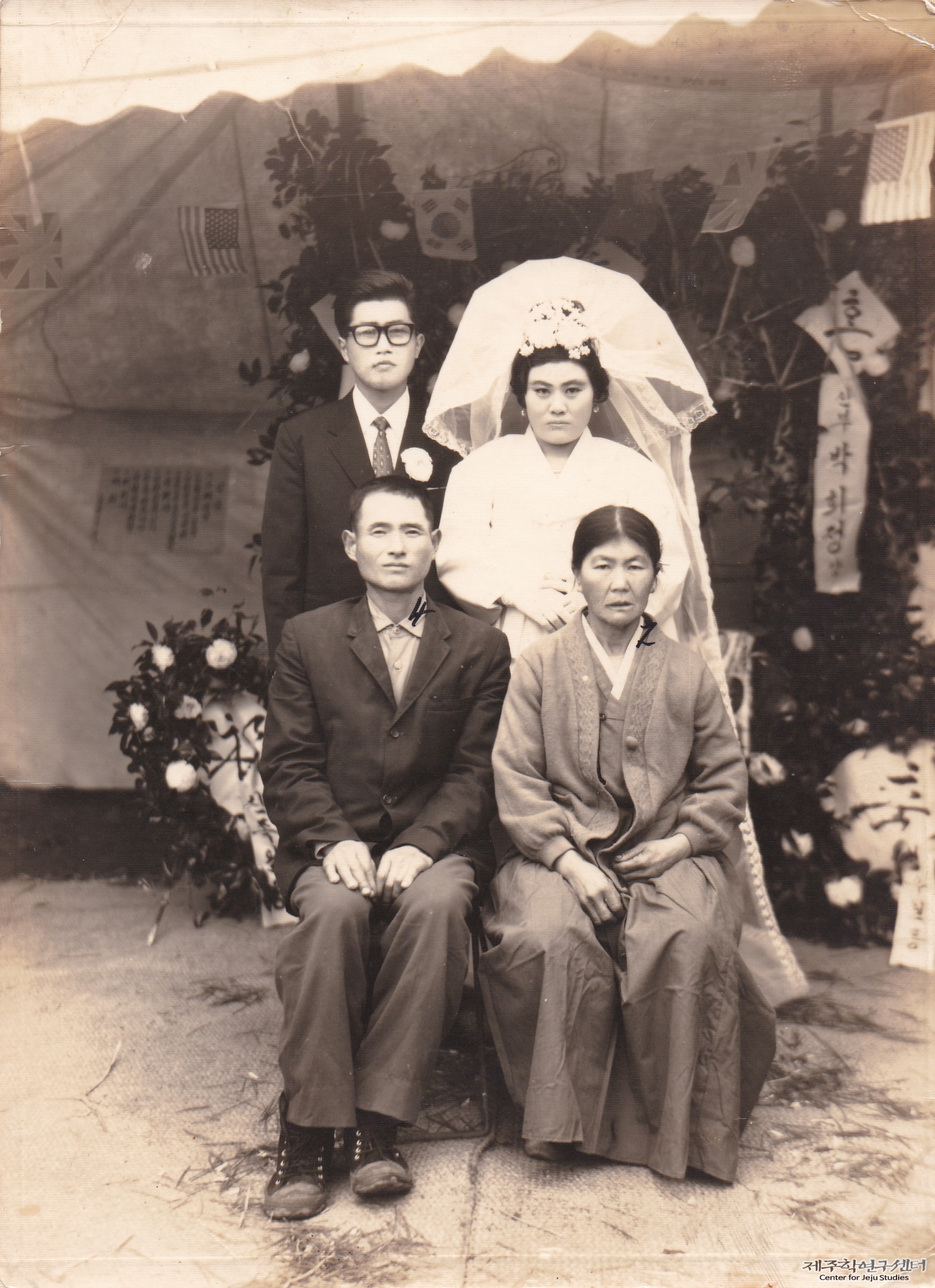 애월읍 수산리 박송자 씨와 양덕윤 씨가 혼례를 마치고 시댁 부모님과 촬영한 사진이다. 시아버지(앞줄 왼편)는 양장 차림으로, 시어머니(앞줄 오른편)는 한복 차림 위에 겉옷을 입고서 머리는 뒤로 쪽을 짓었다. 신랑은 꽃사지를 단 검은 양복 차림이고 신부는 흰색 한복에 면사포를 썼다.