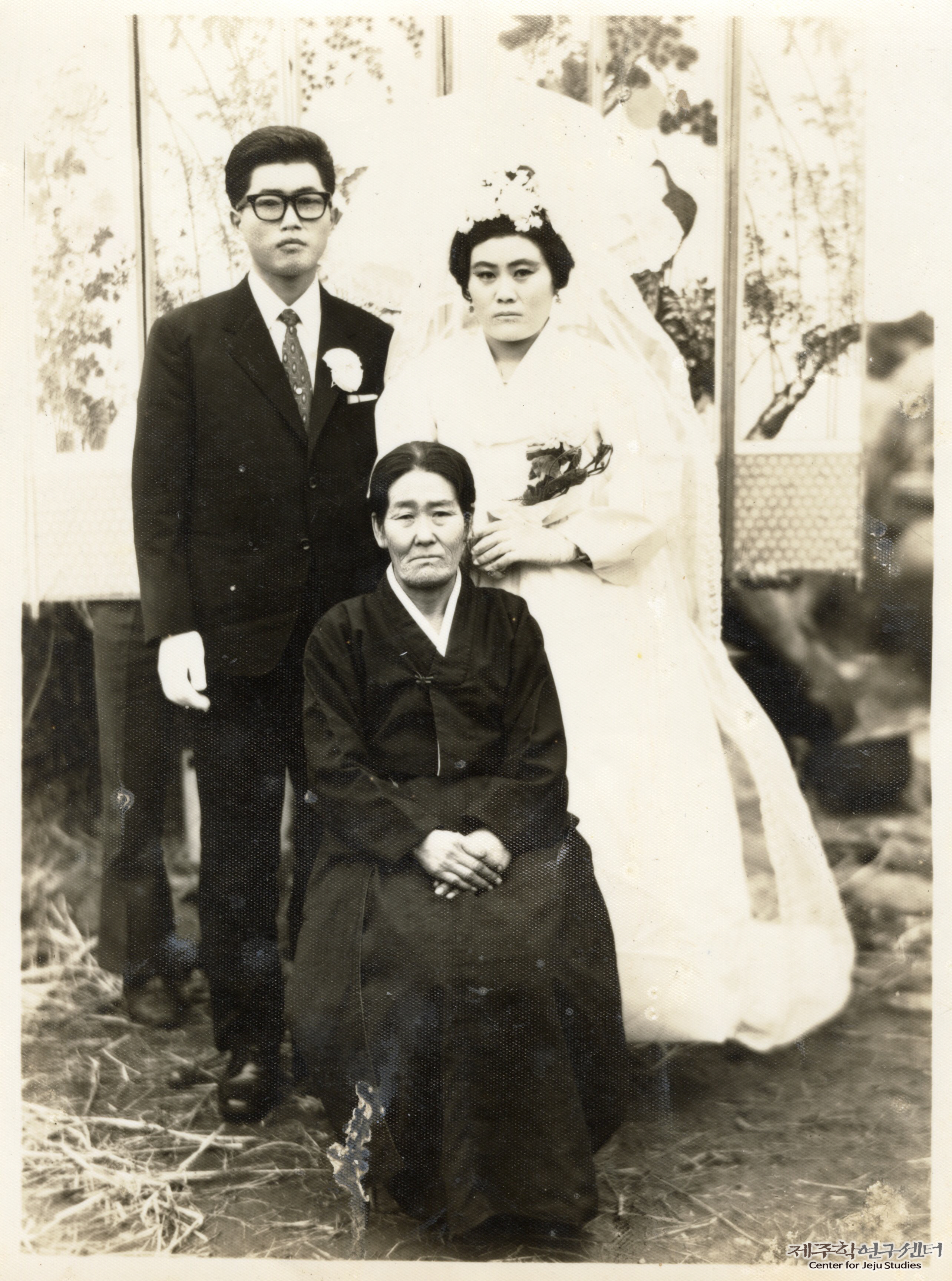 애월읍 수산리 박송자 씨와 양덕윤 씨가 혼례를 마치고 신부 친정어머니와 함께 찍은 사진이다. 어머니는 색이 짙은 양단 저고리치마를 입었으며 머리는 정갈하게 쪽을 찌었다. 신랑신부 뒤편에는 화조도가 그려진 병풍(6~8폭)을 배경으로 삼았다. 박송자 씨 설명에 따르면 병풍의 길이가 짧아 인물 키에 맞추기 위하여 지인들이 병풍을 직접 손으로 높이 들었다고 한다.